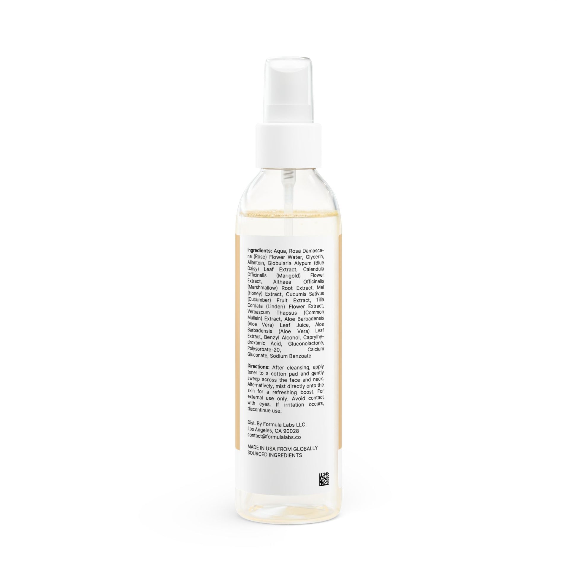 Ingredients: Aqua, Rosa Damascena (Rose) Flower Water, Glycerin, Allantoin, Globularia Alypum (Blue Daisy) Leaf Extract, Calendula Officinalis (Marigold) Flower Extract, Althaea Officinalis (Marshmallow) Root Extract, Mel (Honey) Extract, Cucumis Sativus (Cucumber) Fruit Extract, Tilia Cordata (Linden) Flower Extract, Verbascum Thapsus (Common Mullein) Extract, Aloe Barbadensis (Aloe Vera) Leaf Juice, Aloe Barbadensis (Aloe Vera) Leaf Extract, Benzyl Alcohol, Caprylhydroxamic Acid, Gluconolactone, Polysorbate-20, Calcium Gluconate, Sodium Benzoate.
