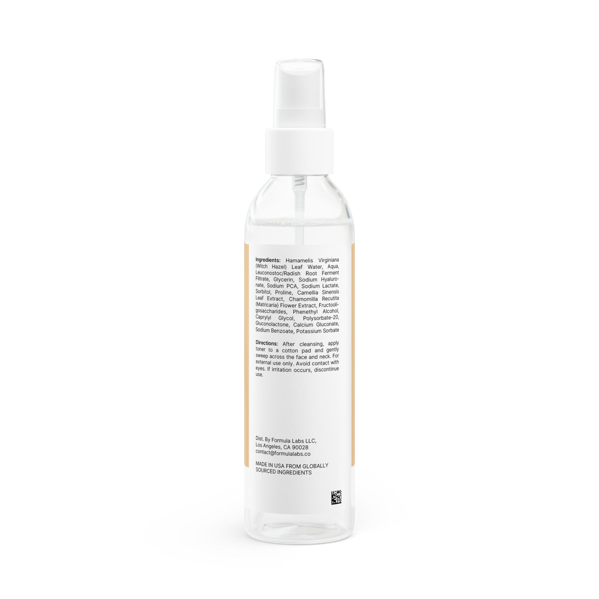 Ingredients: Hamamelis Virginiana (Witch Hazel) Leaf Water, Aqua, Leuconostoc/Radish Root Ferment Filtrate, Glycerin, Sodium Hyaluronate, Sodium PCA, Sodium Lactate, Sorbitol, Proline, Camellia Sinensis Leaf Extract, Chamomilla Recutita (Matricaria) Flower Extract, Fructooligosaccharides, Phenethyl Alcohol, Caprylyl Glycol, Polysorbate-20, Gluconolactone, Calcium Gluconate, Sodium Benzoate, Potassium Sorbate.