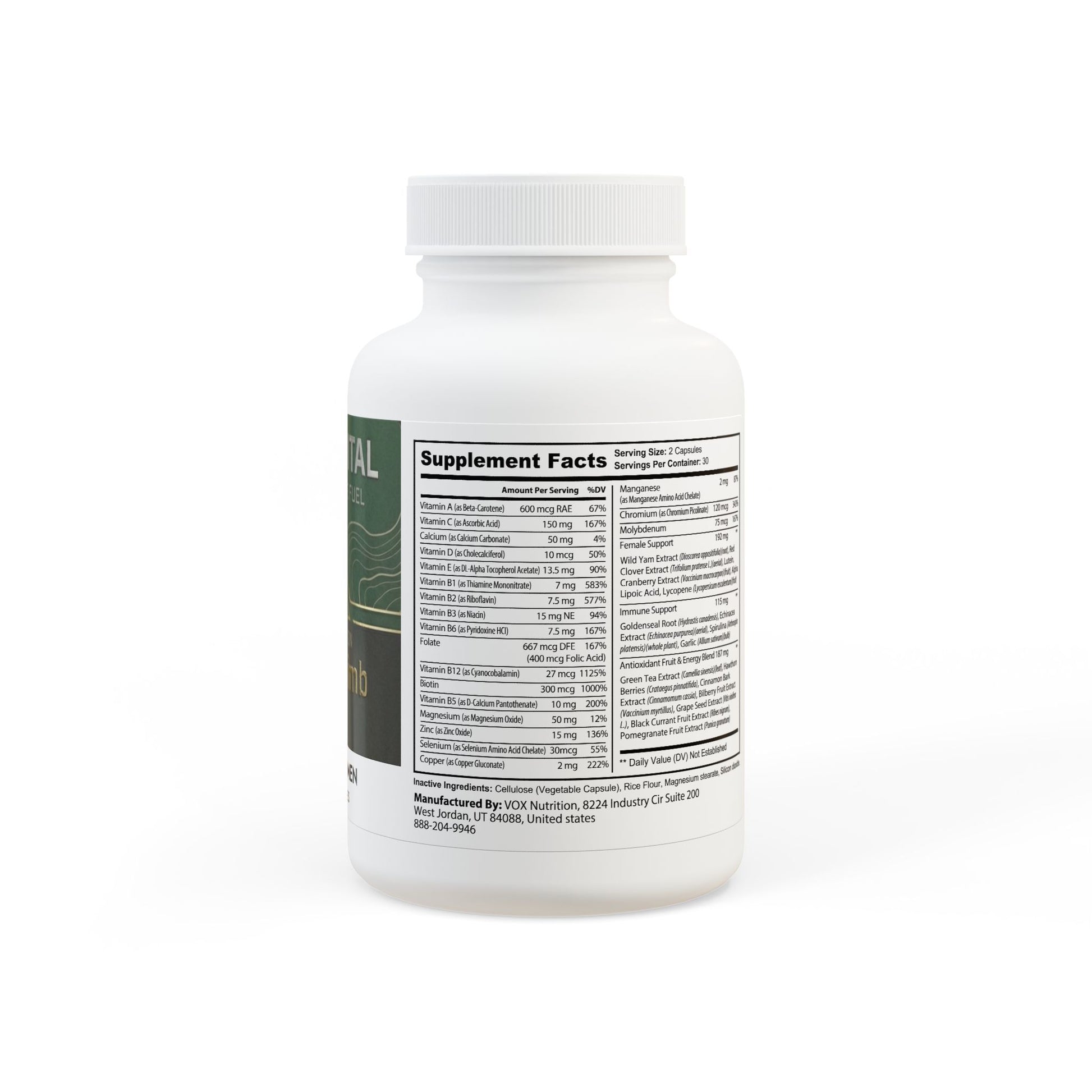 Ingredients: Vitamin A (as Beta-Carotene), Vitamin C (as Ascorbic Acid), Calcium (as Calcium Carbonate), Vitamin D (as Cholecalciferol), Vitamin E (as DL-Alpha Tocopherol Acetate), Vitamin B1 (as Thiamine Mononitrate), Vitamin B2 (as Riboavin), Vitamin B3 (as Niacin), Vitamin B6 (as Pyridoxine HCI), Folate (400 mcg Folic Acid), Vitamin B12 (as Cyanocobalamin), Biotin, Vitamin B5 (as D-Calcium Pantothenate), Magnesium (as Magnesium Oxide), Zinc (as Zinc Oxide), Selenium (as Selenium Amino Acid Chelate), Copper (as Copper Gluconate), Manganese (as Manganese Amino Acid Chelate), Chromium (as Chromium Picolinate), Molybdenum, Wild Yam Extract (Dioscorea oppositifolia)(root), Red Clover Extract (Trifolium pratense L.)(aerial), Lutein, Cranberry Extract (Vaccinium macrocarpon)(fruit), Alpha Lipoic Acid, Lycopene (Lycopersicum esculentum (fruit), Goldenseal Root (Hydrastis canadensis), Echinacea Extract (Echinacea purpurea)(aerial), Spirulina (Arthrospira platensis)(whole plant), Garlic (Allium sativum)(bulb), Green Tea Extract (Camellia sinensis)(leaf), Hawthorn Berries (Crataegus pinnatida), Cinnamon Bark Extract (Cinnamomum cassia), Bilberry Fruit Extract (Vaccinium myrtillus), Grape Seed Extract (Vitis vinifera L.), Black Currant Fruit Extract (Ribes nigrum), Pomegranate Fruit Extract (Punica granatum). Inactive Ingredients: Cellulose (Vegetable Capsule), Rice Flour, Magnesium stearate, Silicon dioxide.