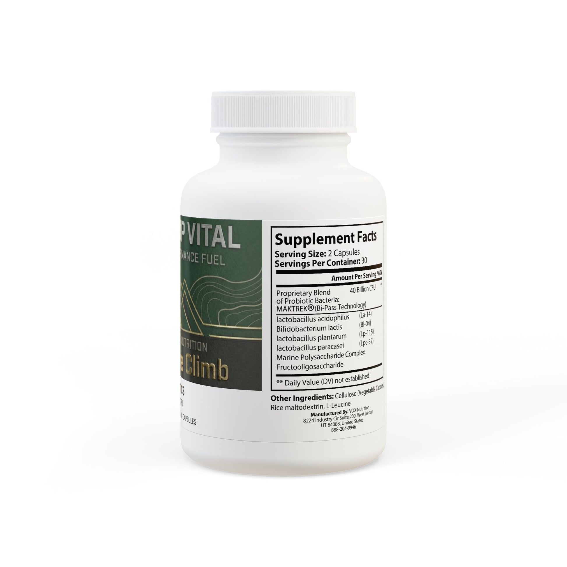 The Base Camp Vital Probiotic Supplement helps support good bacteria in the digestive tract, supports athletic performance and reduces muscle damage while aiding in the reduction of lactate-induced exercise discomfort (muscle burn).