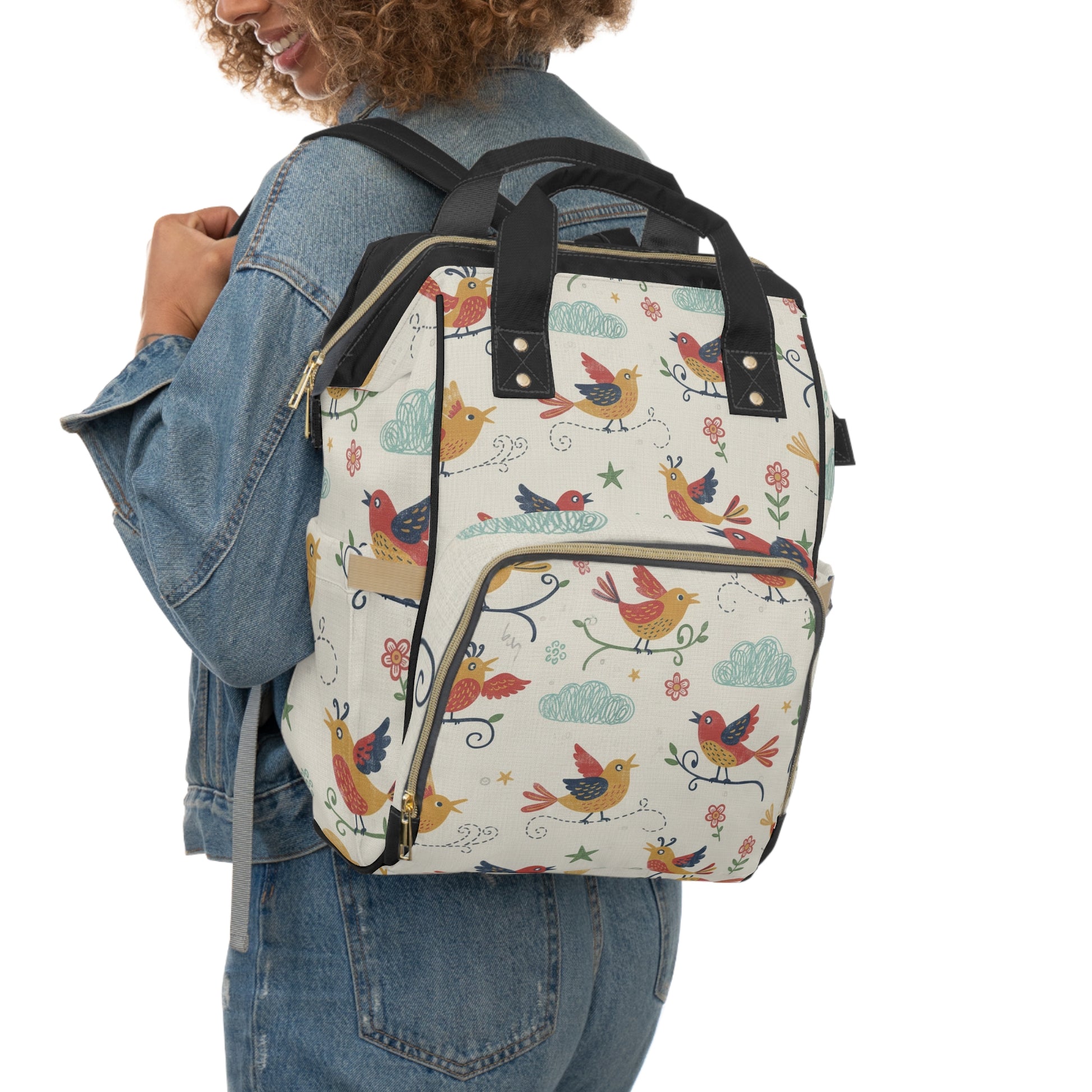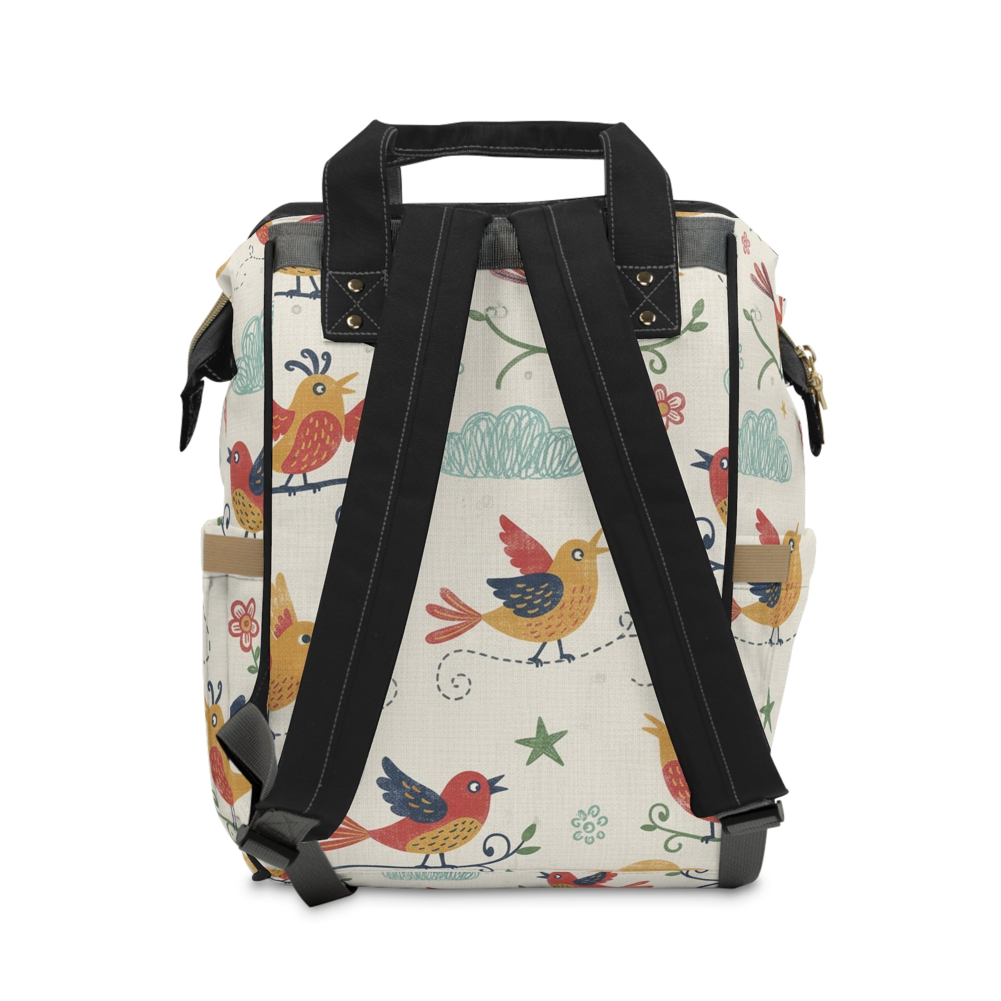 Light, cheerful, and quietly organized — this diaper backpack turns everyday outings into calm, colorful moments. Soft cream fabric is printed with playful, hand-drawn birds and little clouds, so it reads like a favorite storybook carried on your shoulders. The roomy main compartment opens wide for quick access to diapers and a change mat; interior pockets keep wipes, creams, and a change of clothes separated and easy to find. Two side pockets hold bottles or a sippy cup, while the front zip pocket tucks away keys and snacks. Padded straps and a cushioned back make stroller-to-shoulder transitions comfortable, and the durable 1200D nylon stands up to spills, weather, and the small chaos of family life. Bring it to park days, weekend coffee runs, or travel — it feels familiar and steady with every load.