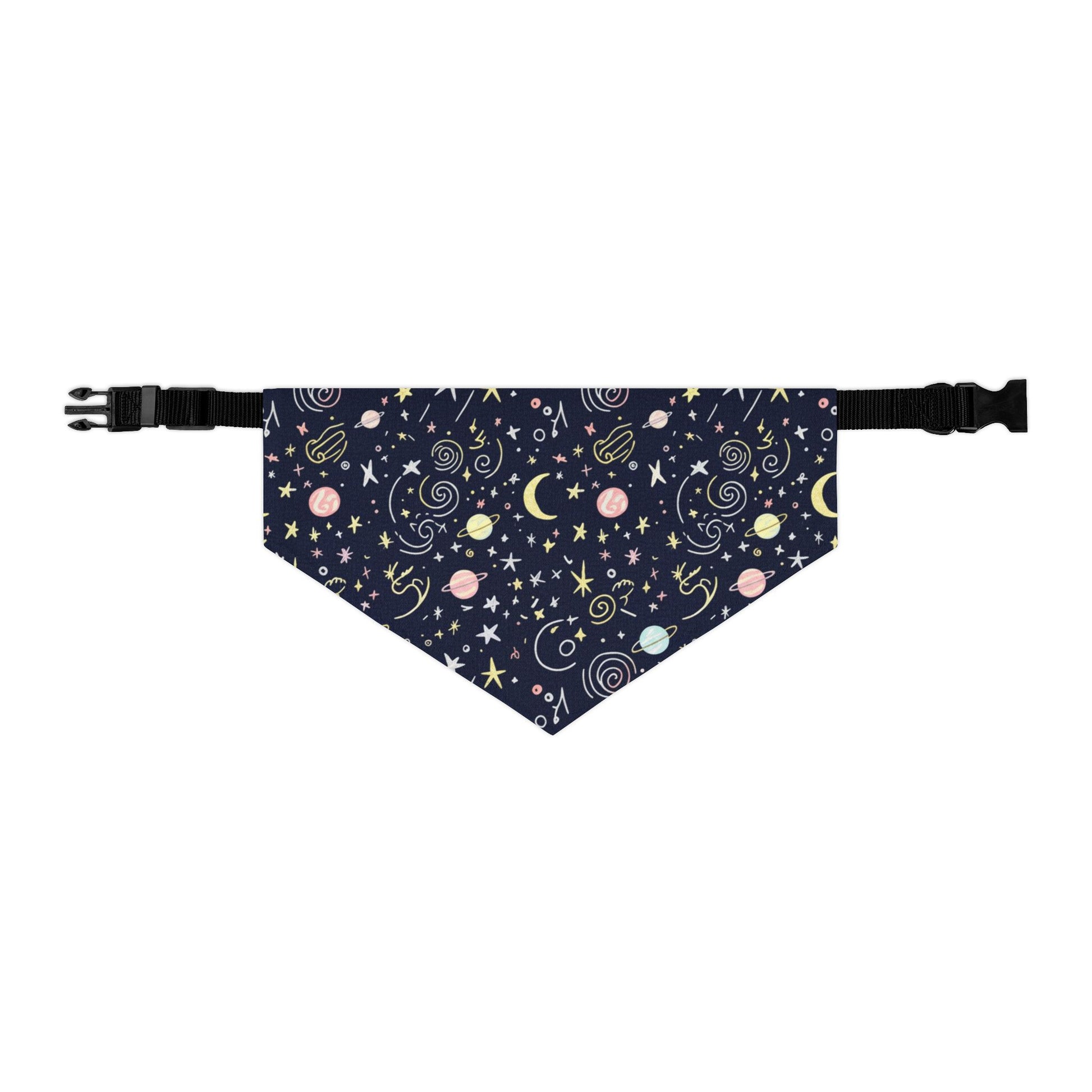 Add a touch of whimsy to your pet's wardrobe with this charming Pet Bandana Collar. Featuring a playful, cosmic design with stars and planets, this bandana is perfect for both everyday adventures and special occasions. Whether your furry friend is lounging at home or strutting in the park, this accessory effortlessly enhances their style. Ideal for dog owners who love to express their pet's personality, it’s a great fit for holidays like Halloween, playful gatherings, or pet-themed celebrations. Your pet will radiate joy and uniqueness, turning heads wherever they go!