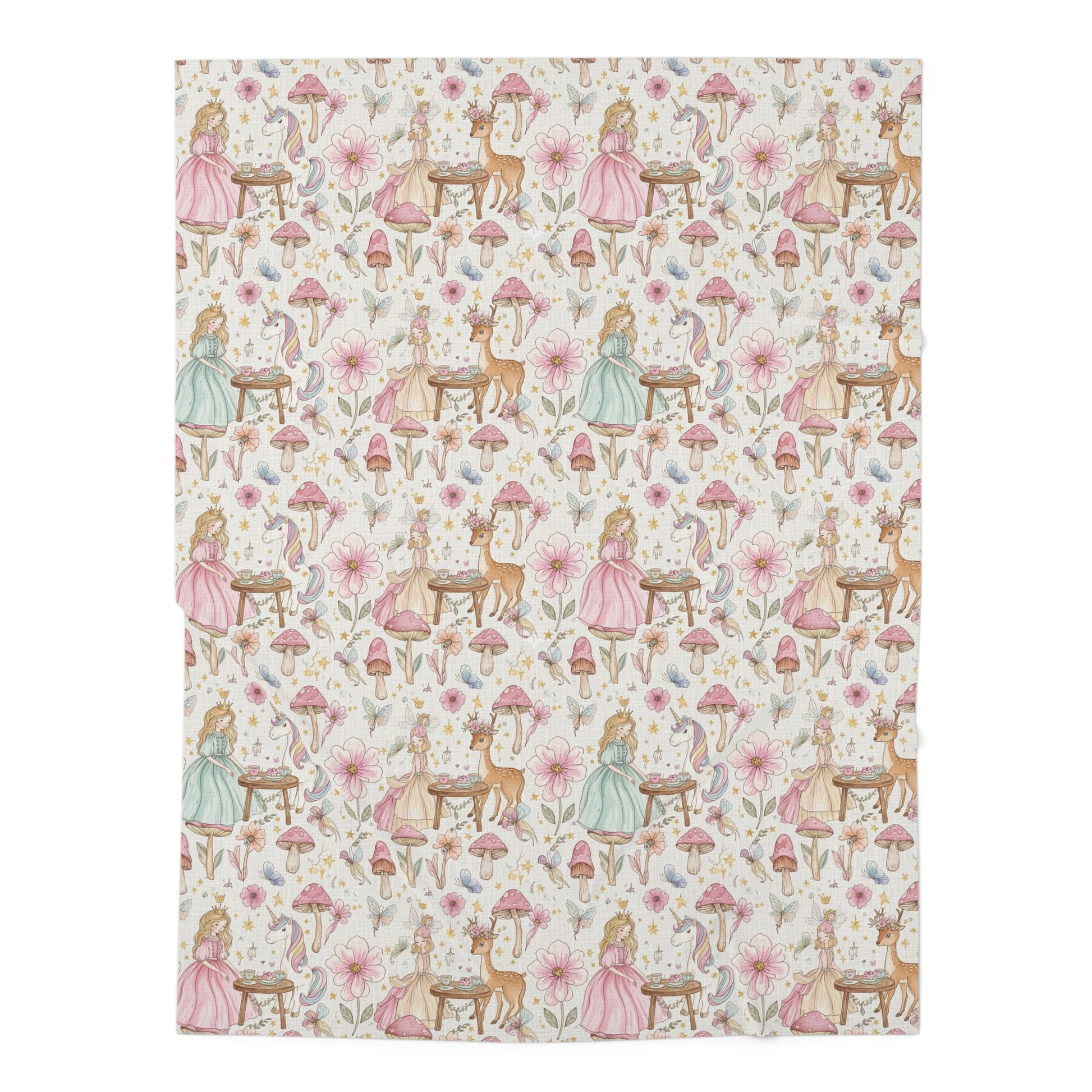 A soft, dreamy swaddle blanket patterned with delicate woodland fairytale illustrations—tiny deer, mushrooms, twirling ballerina-like figures, and soft florals in pastel pinks, greens, and warm neutrals. The 30"×40" jersey polyester gives a smooth, lightweight wrap that breathes while keeping baby snug. The one-sided, vibrant print brings storybook charm to nursery routines: nurseings, stroller naps, or quiet cuddle time. Subtle microfiber speckling is a natural part of the fabric and tends to settle after washing, while slight size variance and pre-constructed symmetry give each piece a handmade, unique feel. Printed in the U.S. with crisp colors, this swaddle adds a whimsical layer to everyday moments with a gentle, vintage-inspired look.