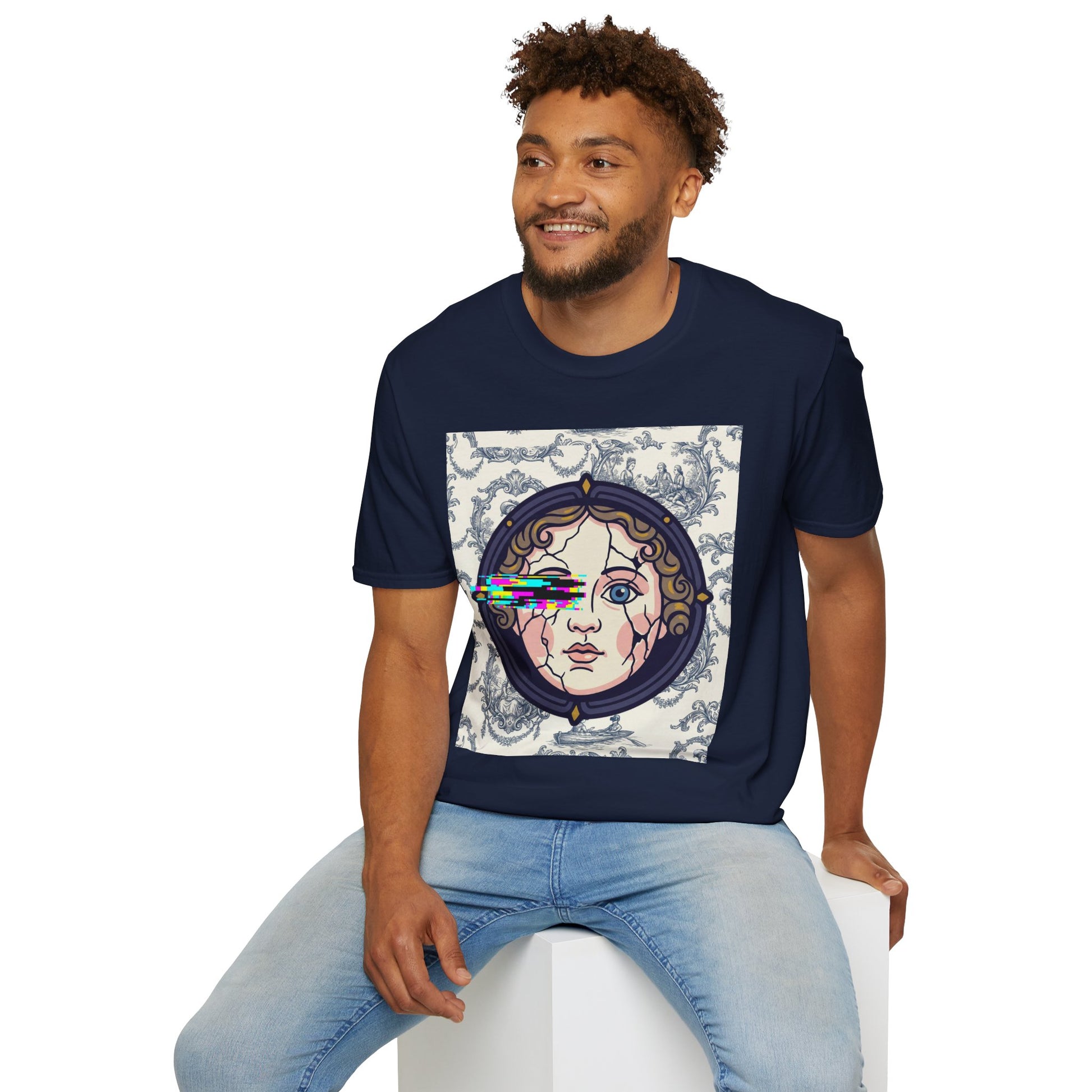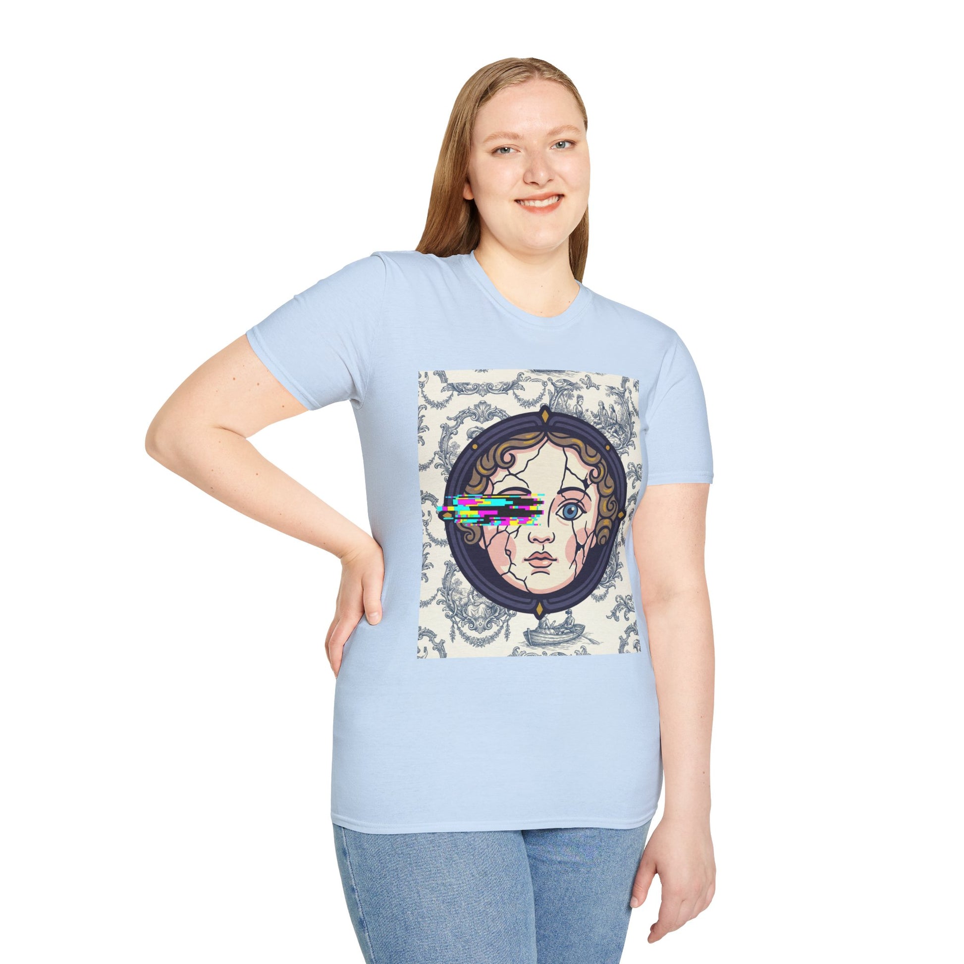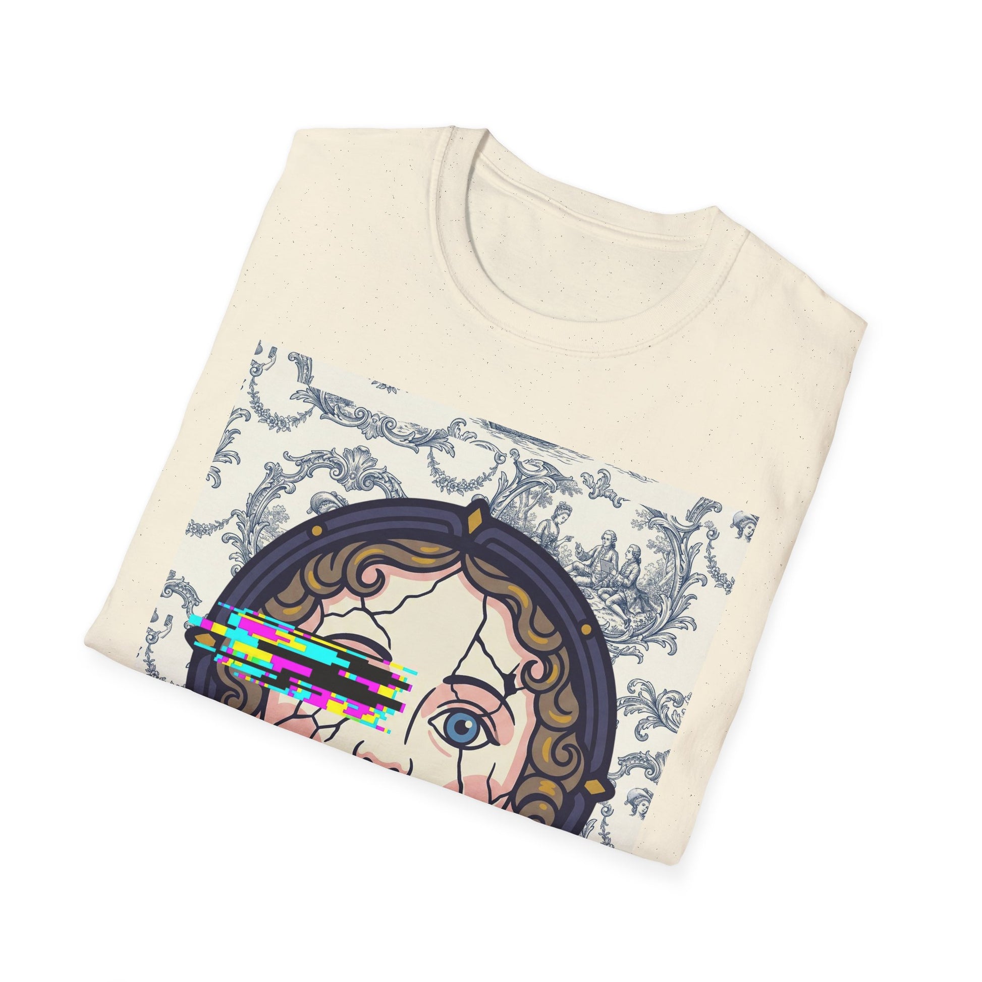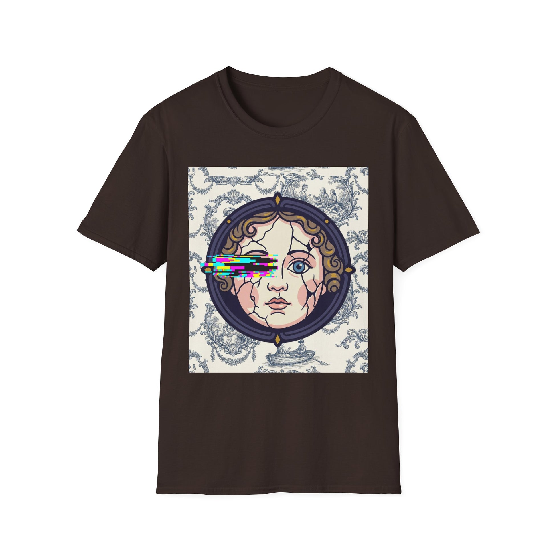 This lightweight crew-neck tee wears like a quiet statement. A vintage-inspired Rococo Smartphone Toile, with cracked porcelain doll face glitch screen portrait sits inside an ornate round frame, but a bright glitch of color slices through the face — a collision of old-world portraiture and modern digital noise. The shirt feels casual and calm, yet the print sparks conversation: soft cotton against bold, slightly unsettling art that hints at nostalgia, disrupted memory, and playful rebellion.