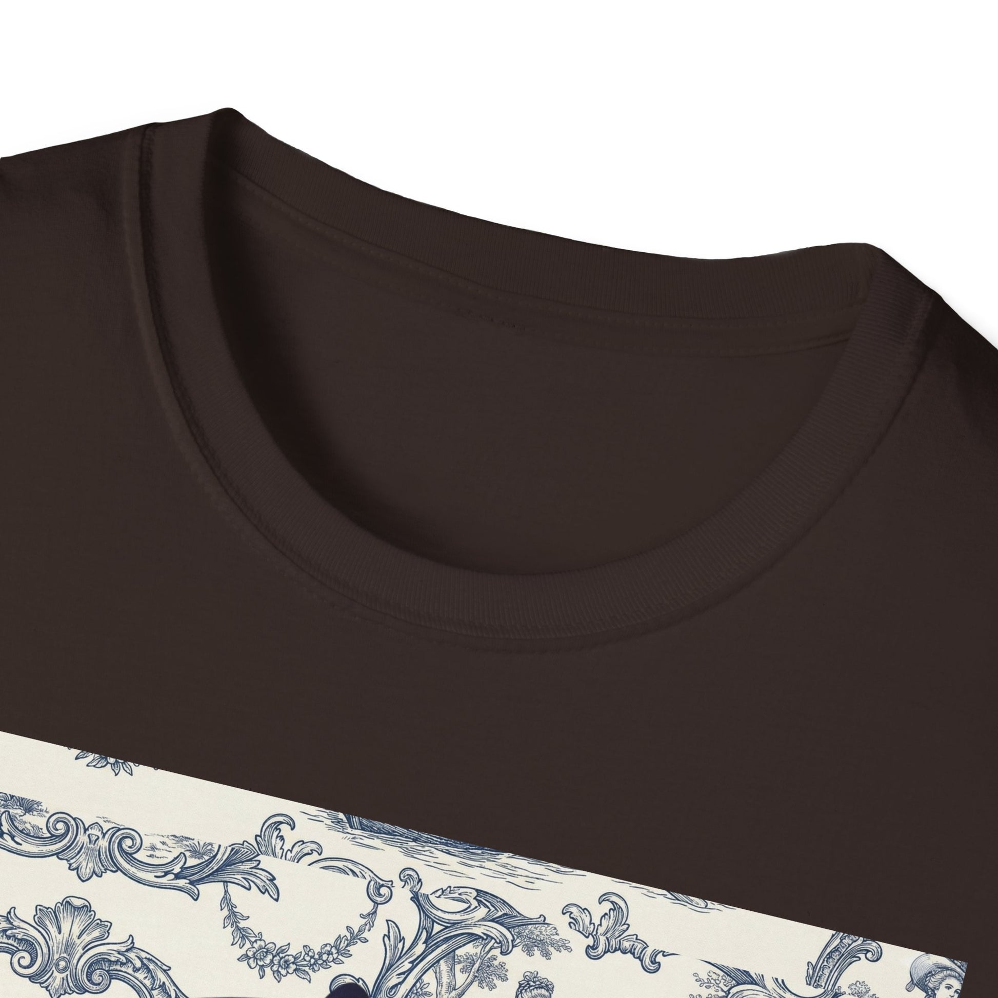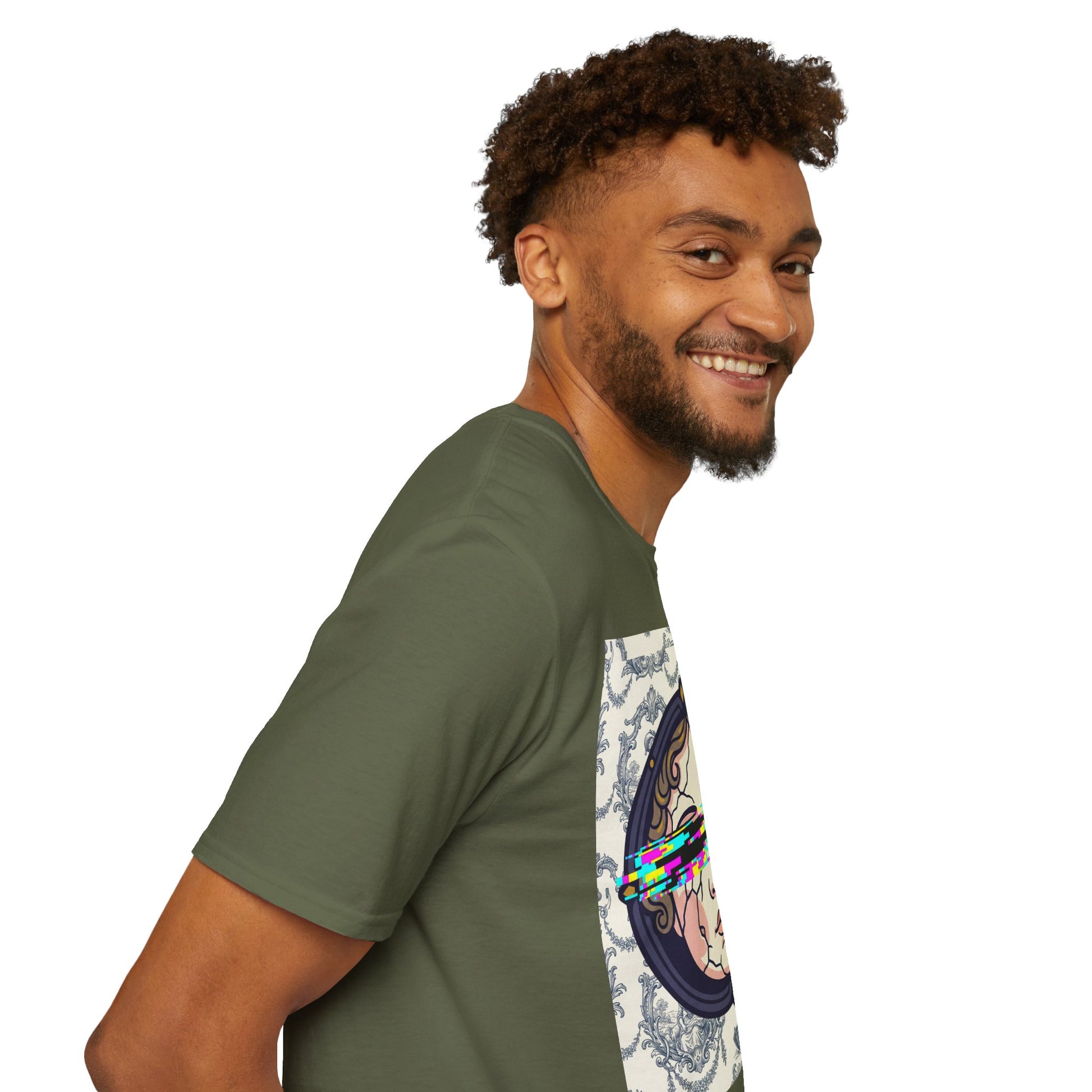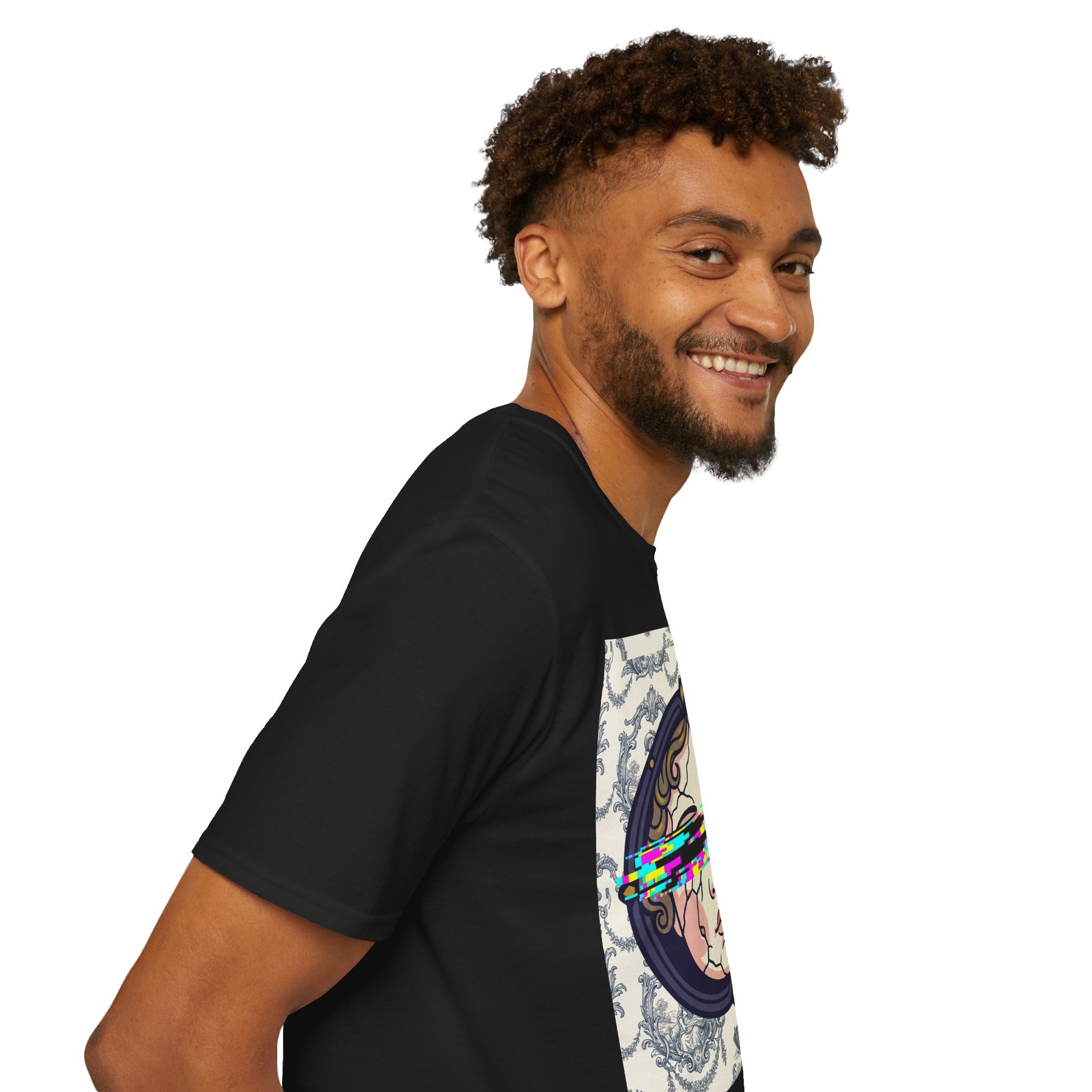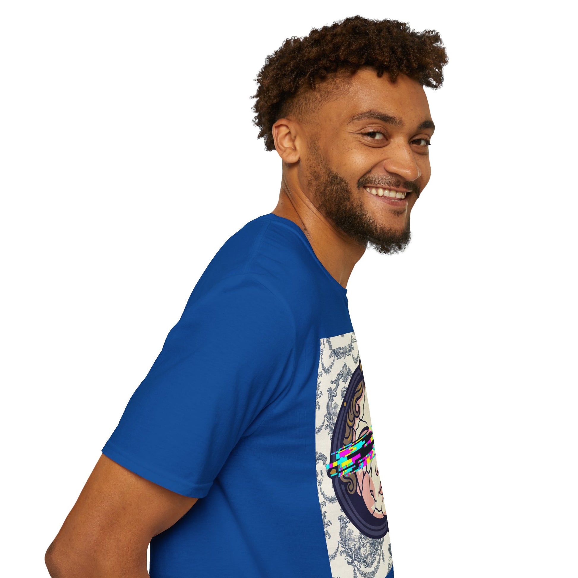 This lightweight crew-neck tee wears like a quiet statement. A vintage-inspired Rococo Smartphone Toile, with cracked porcelain doll face glitch screen portrait sits inside an ornate round frame, but a bright glitch of color slices through the face — a collision of old-world portraiture and modern digital noise. The shirt feels casual and calm, yet the print sparks conversation: soft cotton against bold, slightly unsettling art that hints at nostalgia, disrupted memory, and playful rebellion.