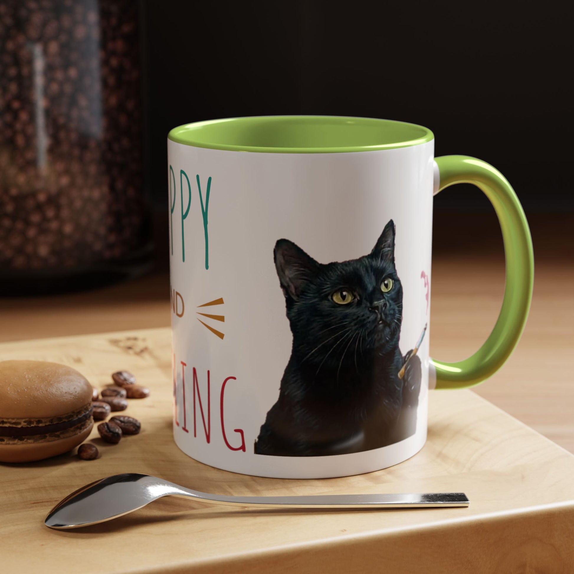 This ceramic accent mug brings a burst of playful charm to slow mornings and busy desks. A glossy white canvas contrasts with a colored interior and handle, framing a whimsical print of a sleek black cat holding a tiny sparkler beside cheerful hand-lettered words. Warm moments feel brighter with every sip — from steaming coffee before a long workday to a calm evening tea break. The sturdy C-handle and vibrant print make this mug a cheerful companion that stands out on shelves and in photos. Dishwasher- and microwave-safe, it blends everyday practicality with a touch of delight.