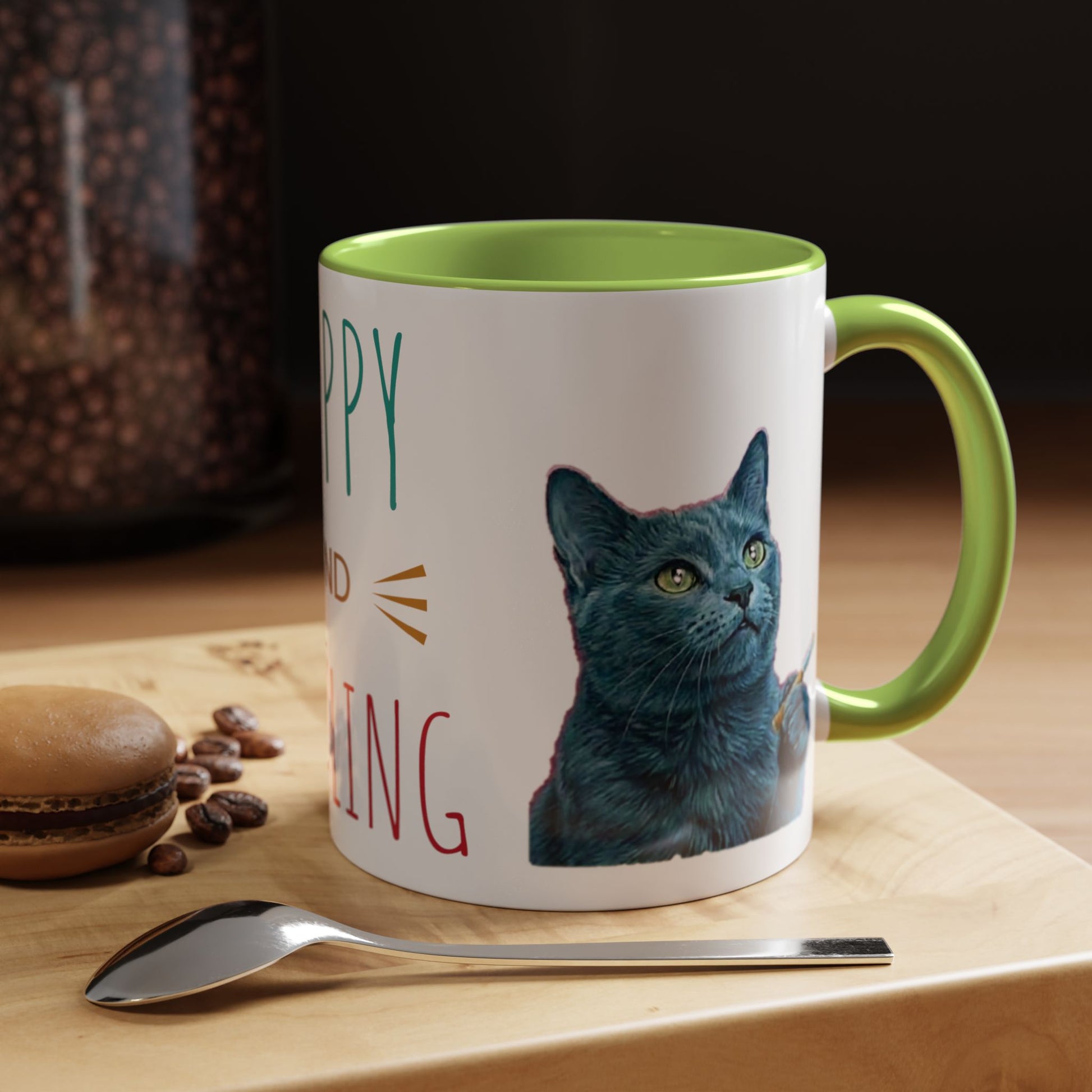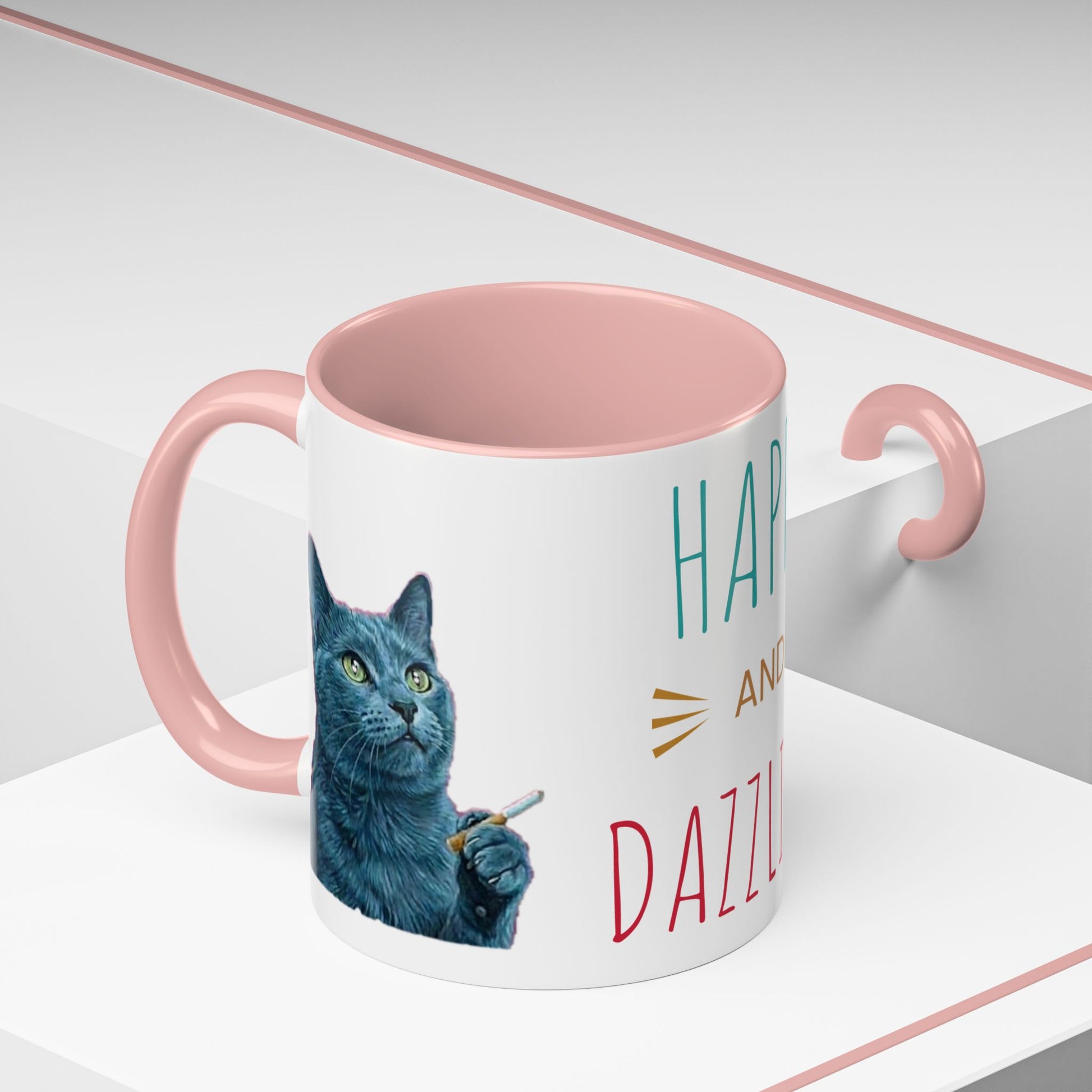 A cozy, cheerful mug that brings a little sparkle to slow mornings and busy afternoons. Bright, playful lettering reads “HAPPY AND DAZZLING” beside a charming, expressive cat illustration — a tiny reminder to start the day lighthearted and a bit mischievous. The colored interior and handle add a pop of contrast that lifts the design, while the glossy ceramic finish catches the light. This mug sits comfortably in hand with its C-shaped handle and holds either a snug 11oz pour or a generous 15oz refill-ready brew, making it easy to sip and savor moments at home, at the desk, or shared over conversation with a friend. Dishwasher- and microwave-safe, it fits into a lived-in routine where color, comfort, and personality matter.