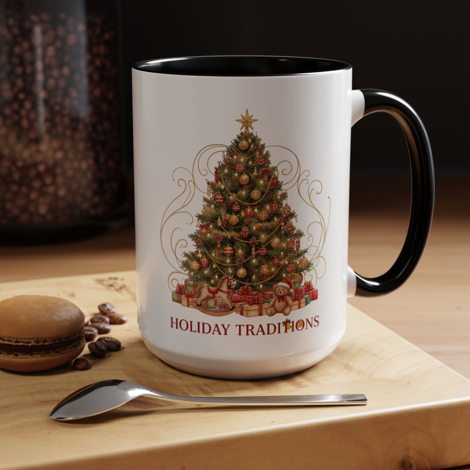 Warmth pours from this ceramic mug like the scent of cinnamon and evergreen. A richly decorated Christmas tree, wrapped in golden swirls and gifts, sits against the glossy white canvas, while the colored interior and handle give it a cozy, vintage holiday feel. Hold it on a quiet morning as the house wakes, set it on a mantle with twinkling lights, or bring it to a family brunch — it carries the small comforts that make seasonal rituals feel familiar and joyful. The balanced C-handle fits naturally in hand; the bold print keeps its color through countless washes. This mug is for people who collect moments — quiet sips beside a decorated tree, stories traded over cocoa, and the soft glow of holiday traditions.