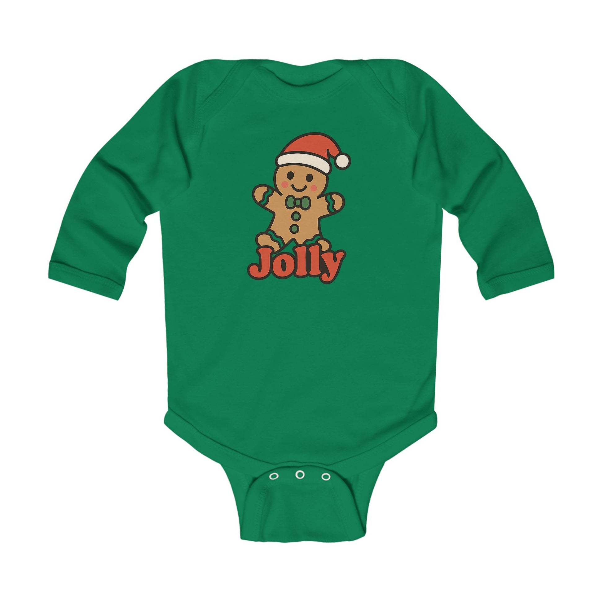 Tiny holiday mischief, soft as a hug. This long-sleeve infant bodysuit features a cheerful gingerbread wearing a Santa hat and the playful word “Jolly” beneath. Lightweight, breathable cotton and gentle ribbed binding let little ones squirm, crawl, and nap without fuss. The gentle silhouette layers easily under sweaters or peeks out from over festive pants, bringing a warm, cozy note to family photos, tree-trimming afternoons, or quiet nights by the twinkling lights. It feels homemade and honest — the kind of piece parents reach for when they want their baby to look merry while staying comfy and fuss-free.