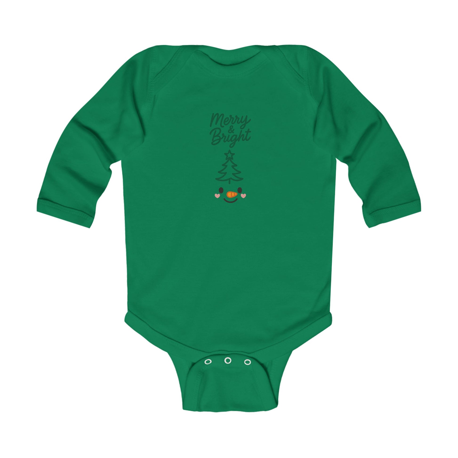 Small and soft, this long-sleeve infant bodysuit brings a gentle, wintry charm to baby’s first holiday moments. A simple green tree with a cheerful snowman face and the hand-lettered “Merry & Bright” sit near the chest, adding a cozy, homespun touch without overwhelming tiny shoulders. The lightweight cotton fabric and ribbed knit binding move with baby, while three snaps at the cross closure make changes quick and fuss-free. Breathable and gentle on sensitive skin, it layers easily under sweaters or worn alone for a crisp holiday photo or a quiet morning by the tree.