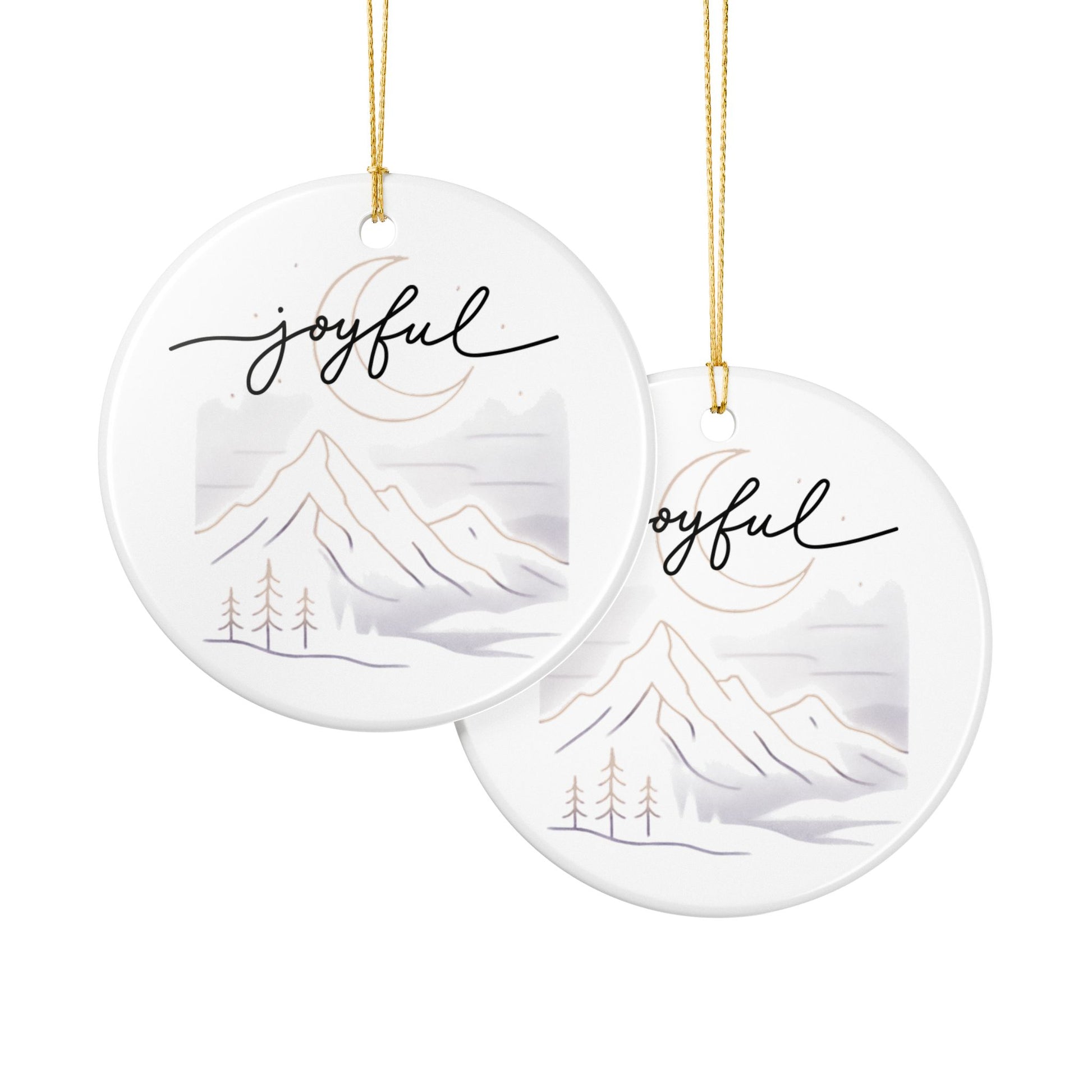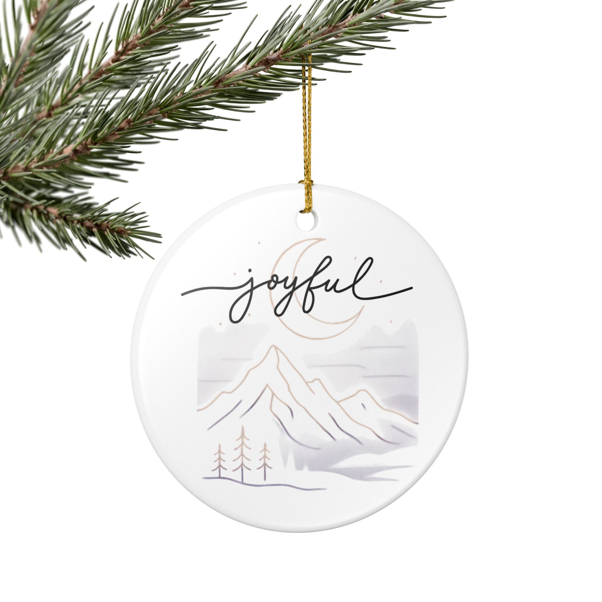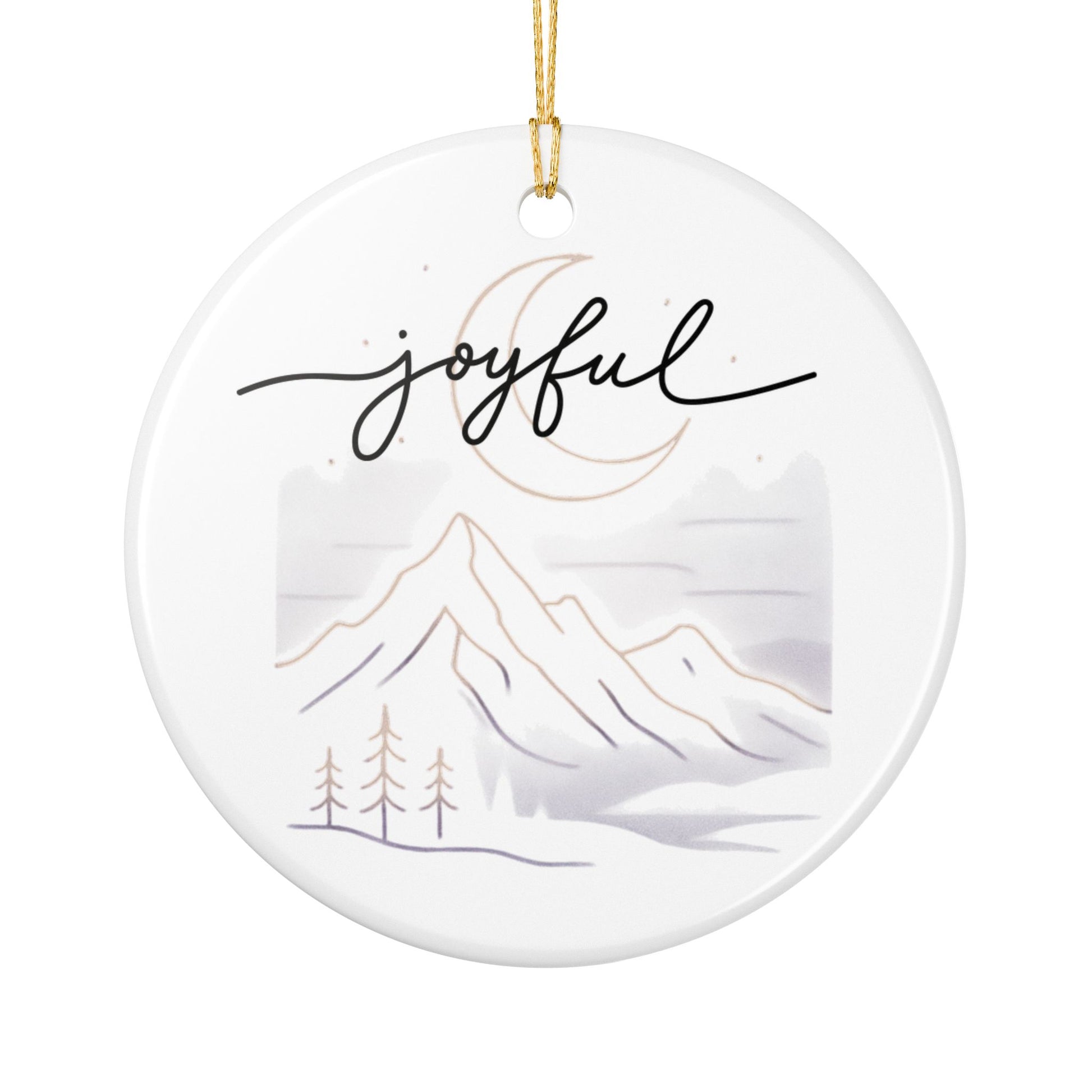 A delicate ceramic ornament that brings a quiet, wintry calm to any space. Smooth, glossy white ceramic frames a soft watercolor scene of mountains, pines, and a crescent moon, with the handwritten word “joyful” arcing above. Subtle matte-print details and faint golden accents catch the light without overwhelming the design. Hung from the included gold string, this single-sided ornament adds a gentle, serene touch to holiday trees, windows, or seasonal displays — a small, thoughtful accent that feels handmade and mindful.
