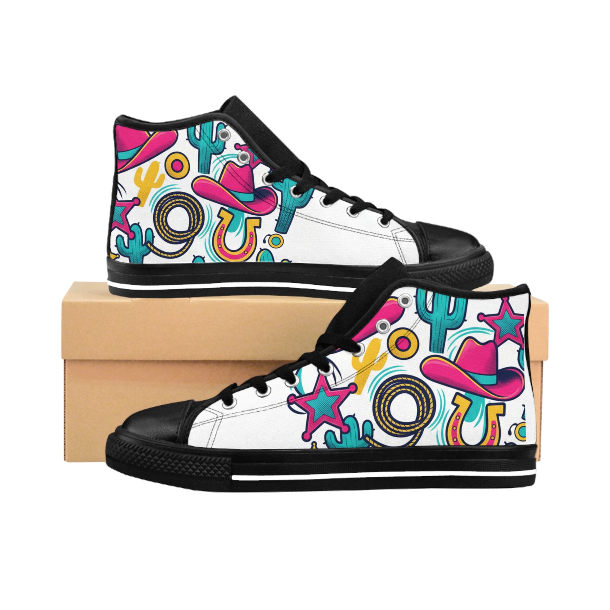 Men's High-Top Sneakers — Colorful Retro Western Pattern (Cowboy Hat, Cactus, Horseshoe) (free shipping)