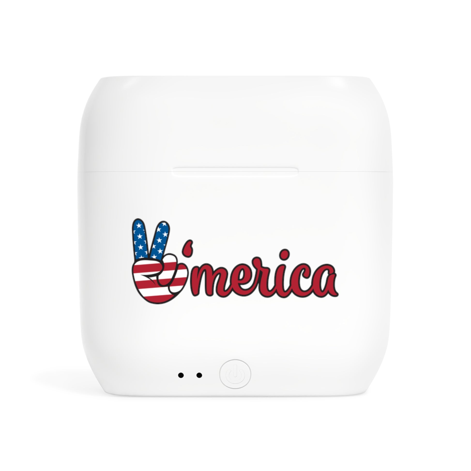 Compact wireless earbuds with a patriotic vibe — small, comfortable, and built to keep up with busy days. The ergonomic ABS housings sit lightly in your ears while Bluetooth 5.0 pairs quickly and reliably. Playback controls and dual microphones make hands-free calls and track changes simple. The charging case holds a 400mAh battery that doubles as a powerbank, delivering up to four full earbud charges and topping the buds from empty to full. Comes with three sizes of rubber tips and a USB charging cable so you can tailor the fit and keep listening on the move. The subtle 'Merica' graphic gives the case a playful, Americana touch suited to summer gatherings, parades, and road trips.