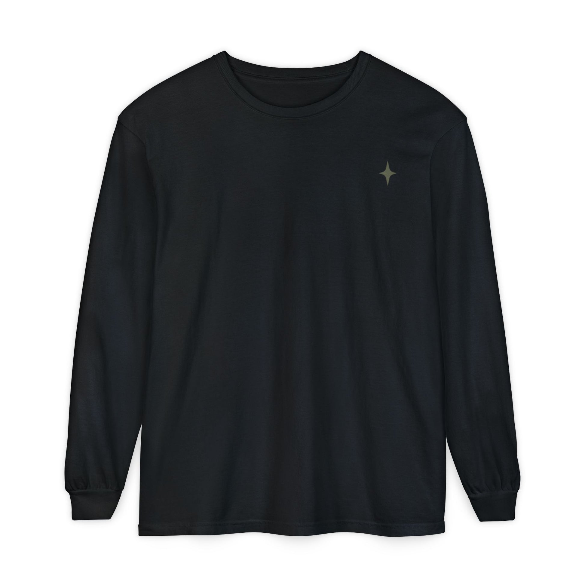 This long-sleeve garment-dyed tee feels like a quiet, intentional layer you pull on when you want comfort without shouting. The soft, broken-in color and medium-weight ring-spun cotton drape easily over a classic fit, while ribbed cuffs and neck/shoulder tape keep the silhouette tidy after repeated wear. A small, subtle star motif near the chest reads like a personal emblem — low-key, thoughtful, and easy to pair. Wear it on cooler mornings at the café, for slow walks through neighborhood streets, or layered under a jacket for late-night runs to the record shop. It’s made to age gently with you: the dye and fabric settle into a lived-in softness that tells a story over time.