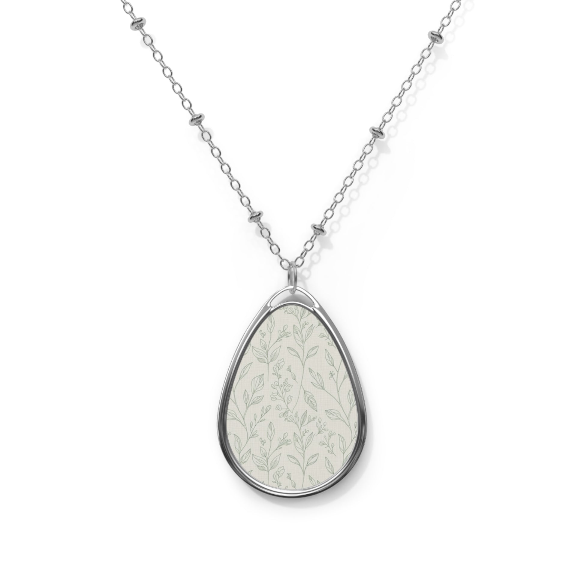 A delicate ellipse pendant necklace that brings quiet elegance to everyday wear. The glossy, full-color print on a white aluminum surface captures subtle patterns and soft hues with vivid clarity. Framed in a polished zinc-alloy bezel, the teardrop-shaped pendant hangs from a refined chain with tiny bead accents, closing securely with a lobster clasp. Wear it layered with your favorite pieces or alone to let the gentle pattern and lustrous finish speak for itself—comfortably lightweight, thoughtfully finished, and made to accompany slow mornings, cozy gatherings, and meaningful moments.