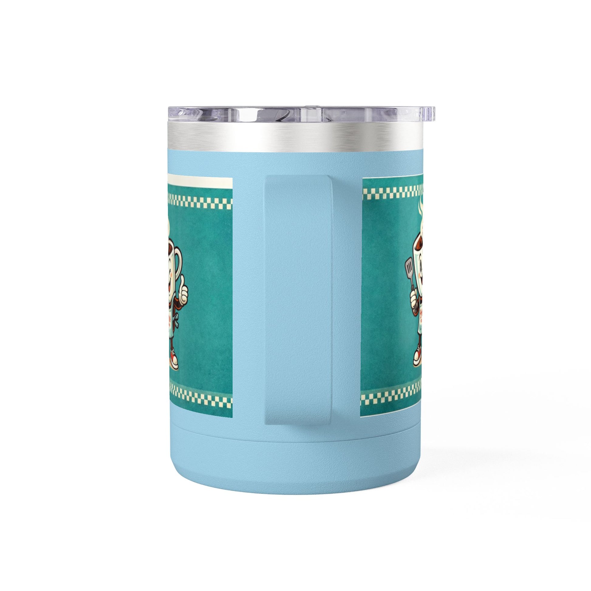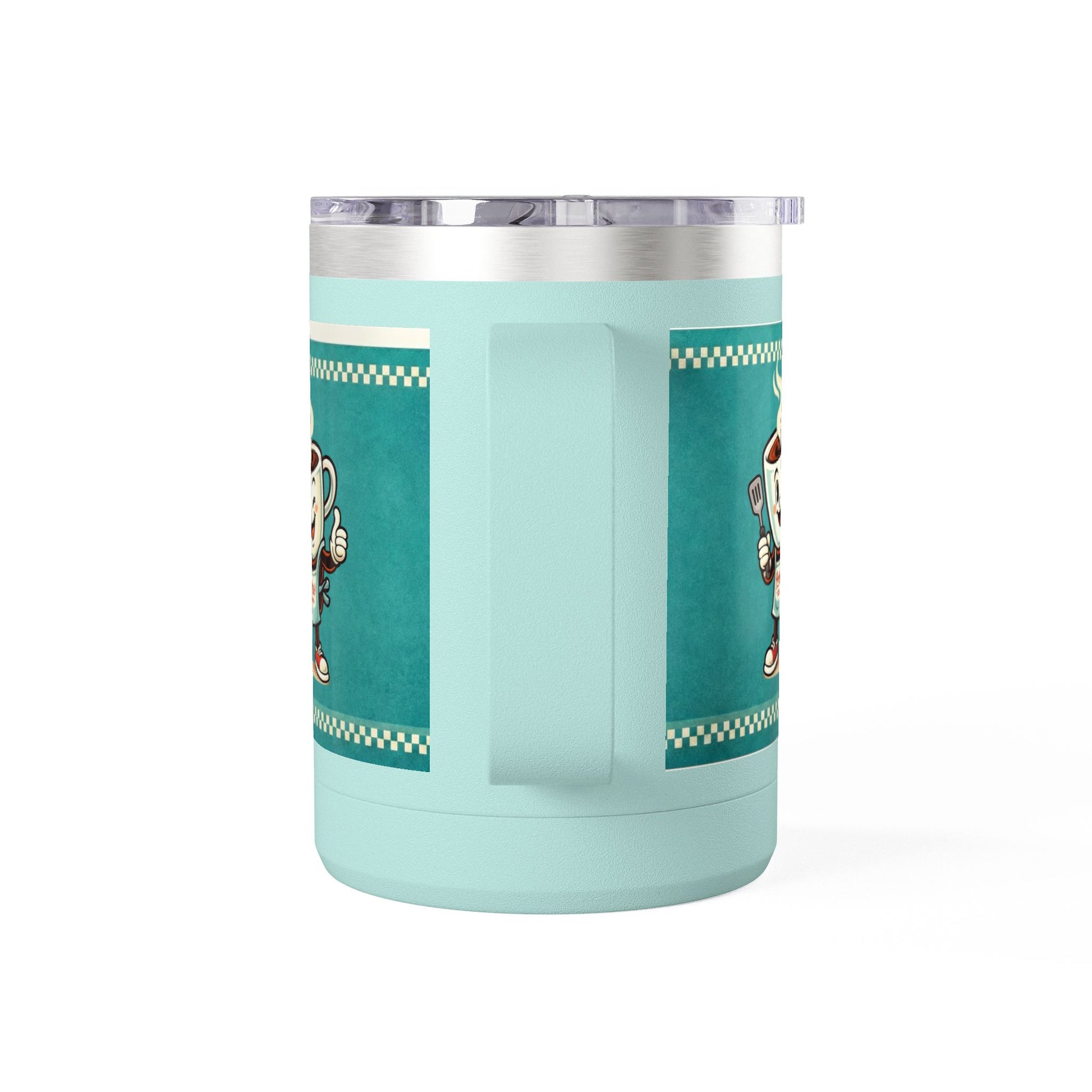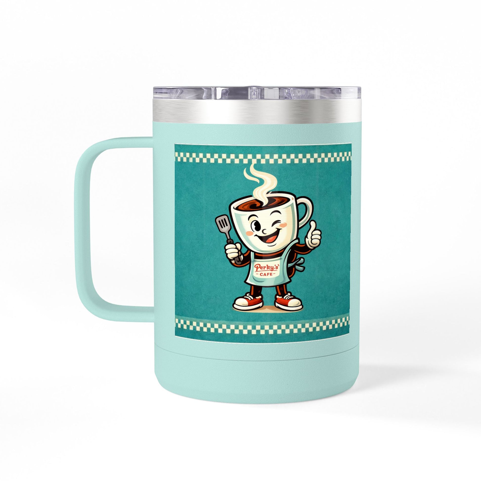 Perky’s Cafe KS Retro Teal 15oz Stainless Tumbler w/ Handle- Mug Tumbler — Cute Smiling Coffee Cup Character, 15oz Travel Mug (free shipping)