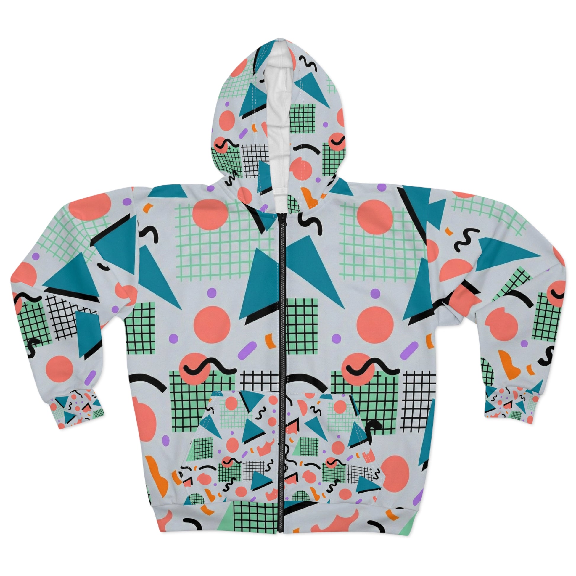 This vivid zip-up hoodie brings playful retro energy to everyday wear. The all-over print blends geometric shapes, squiggles, and soft pastel tones for a nostalgic 80s/90s vibe that feels lively without shouting. Lightweight but structured, it layers easily over tees and knits. Slide your hands into the roomy front pockets on cool mornings, zip up the bold black zipper when you need a little extra warmth, and let the custom cut-and-sewn patterning wrap you in color. It's built from durable, quick-drying polyester that keeps its shape and holds bright, full-coverage prints wash after wash. Wear it to brighten a commute, a weekend market run, or a laid-back meet-up with friends — it reads like a fun, confident accent in any casual wardrobe.