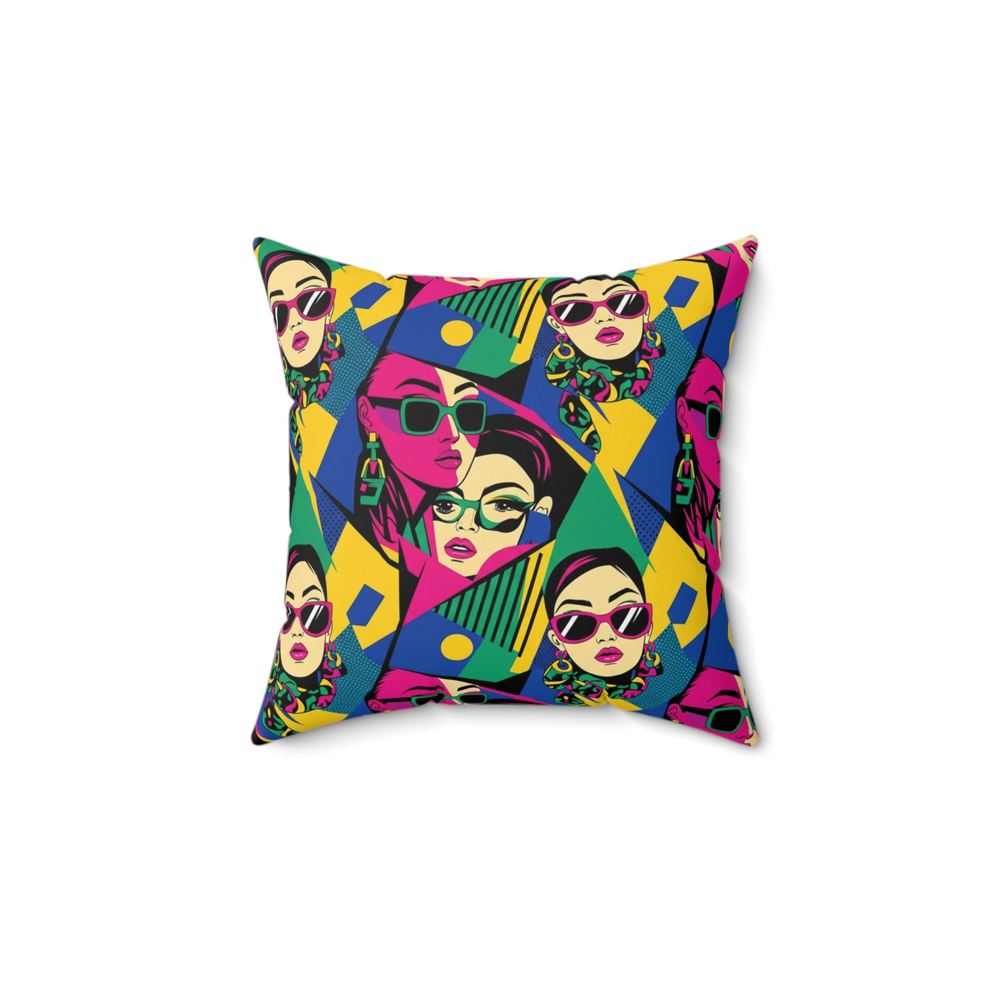 This vibrant square pillow brings bold, retro-pop art energy to any room. Saturated magenta, teal, yellow and deep blue form a geometric backdrop for stylized female faces wearing oversized sunglasses and statement earrings. The double-sided print keeps the pattern visible from every angle, while the concealed beige zipper maintains a clean edge. Light, resilient spun polyester holds the design crisp and wrinkle-free — slide in the recycled polyester insert and watch the pillow fill out with a plush, slightly overstuffed look that reads luxurious and playful. It livens up living rooms, creative studios, or a chic reading nook and pairs especially well with eclectic, mid-century, or pop-art décor.