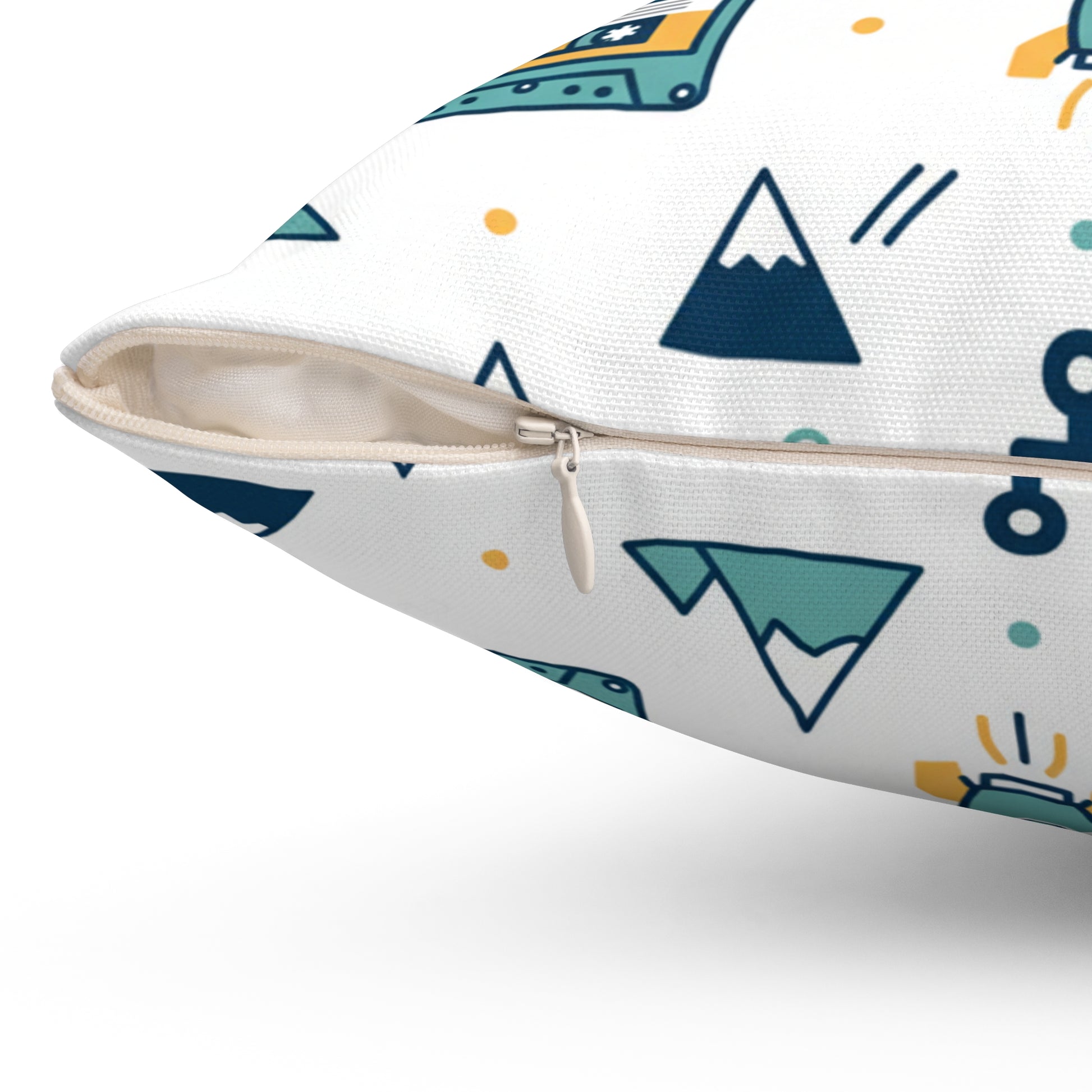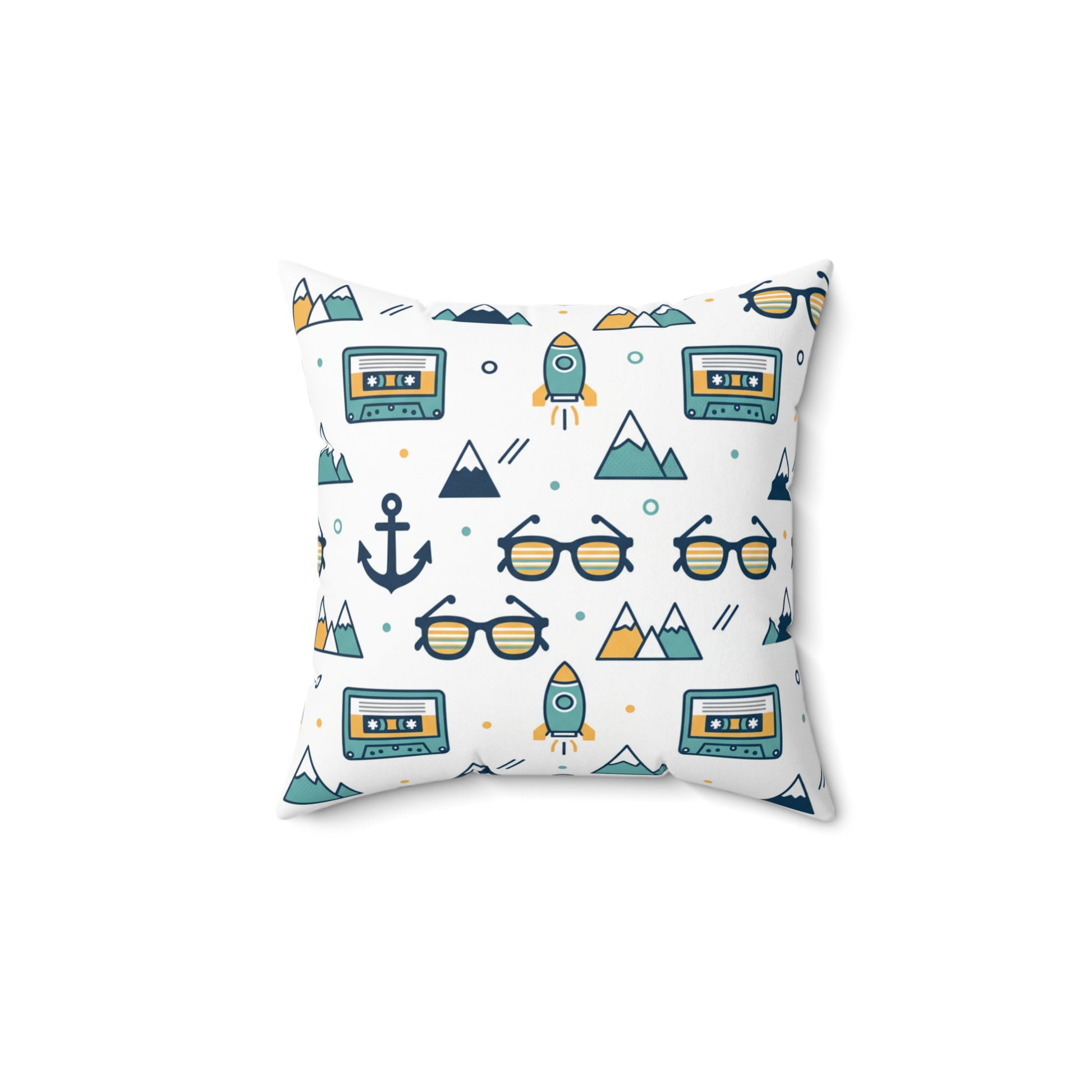Bright, playful pillow cover that brings a lighthearted, vintage-adventure vibe to casual spaces. Soft spun polyester holds crisp double-sided prints of retro cassettes, rockets, anchors, mountains, and sunglasses on a clean white background. The concealed beige zipper keeps the silhouette neat while the roomy recycled-poly insert (shipped separately) puffs the cover into a plush, full pillow. It layers easily on couches, daybeds, or reading nooks to add a touch of nostalgic wanderlust and sunny energy.
