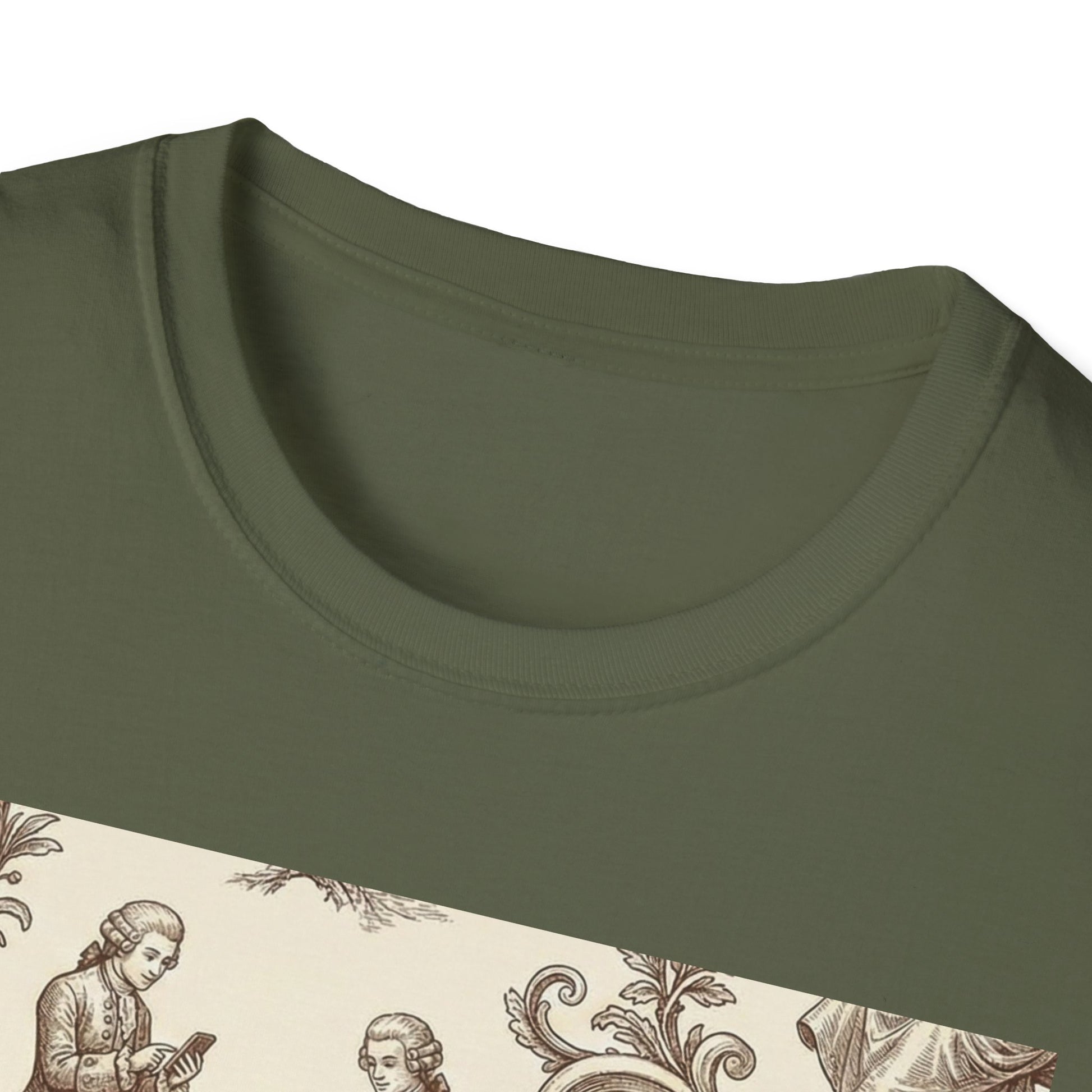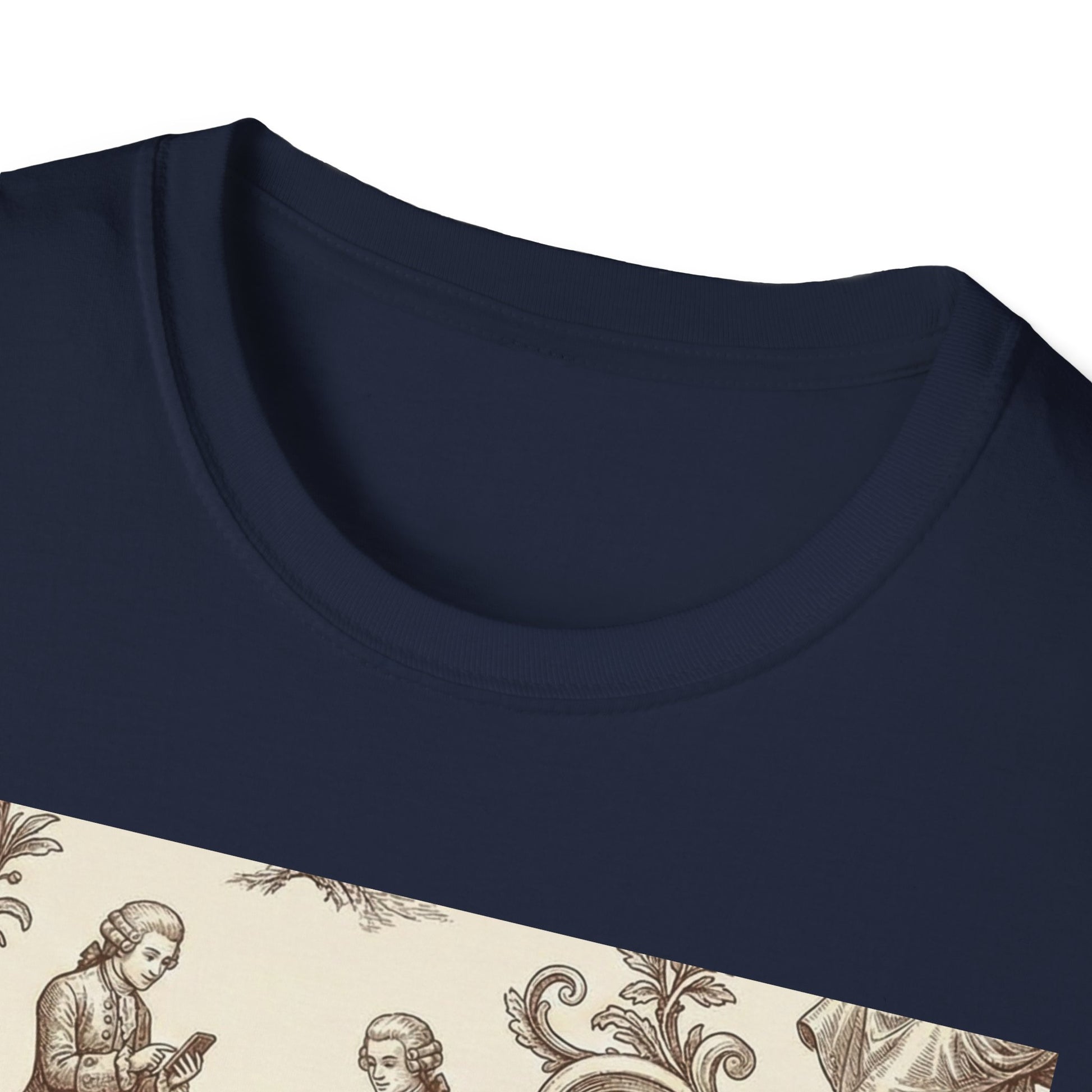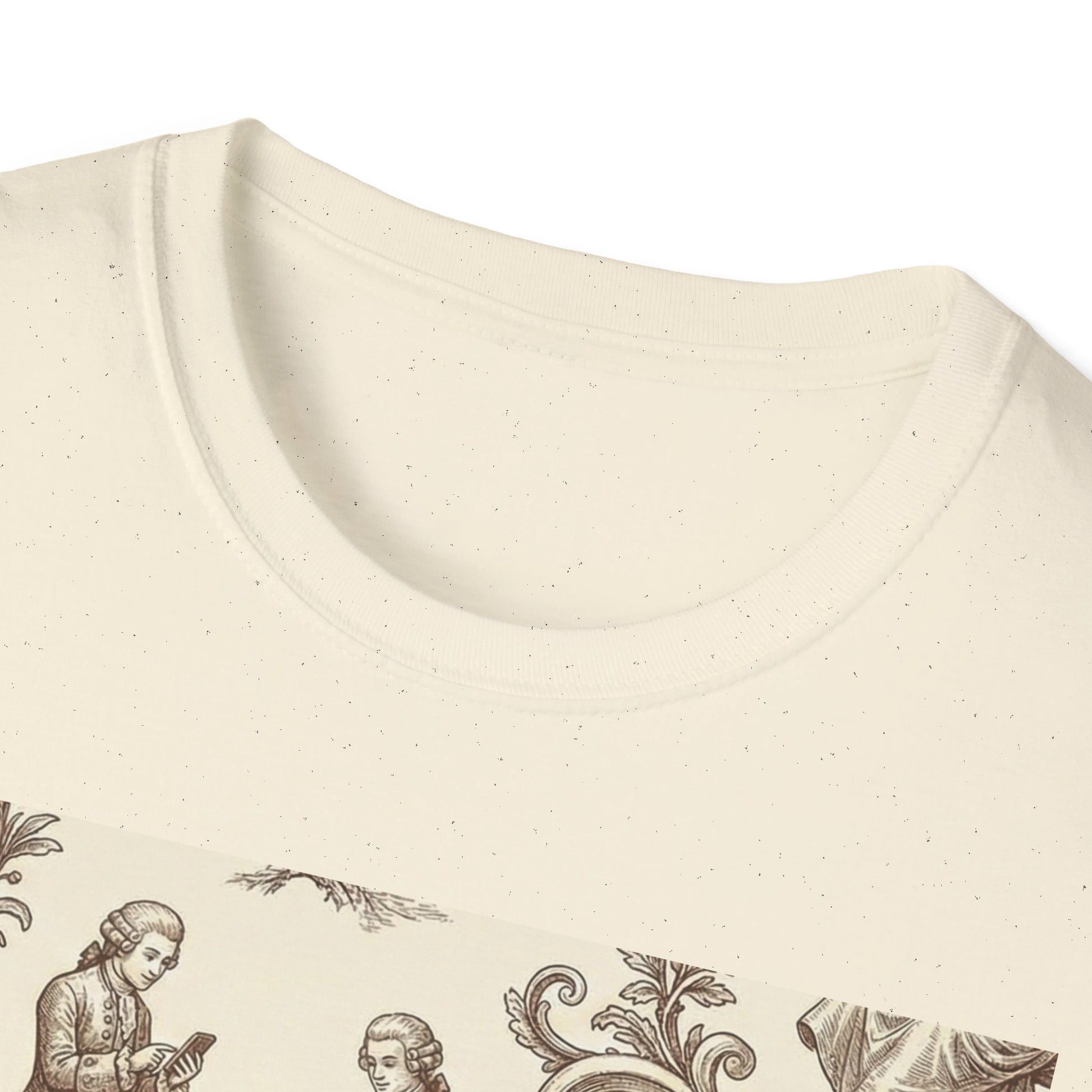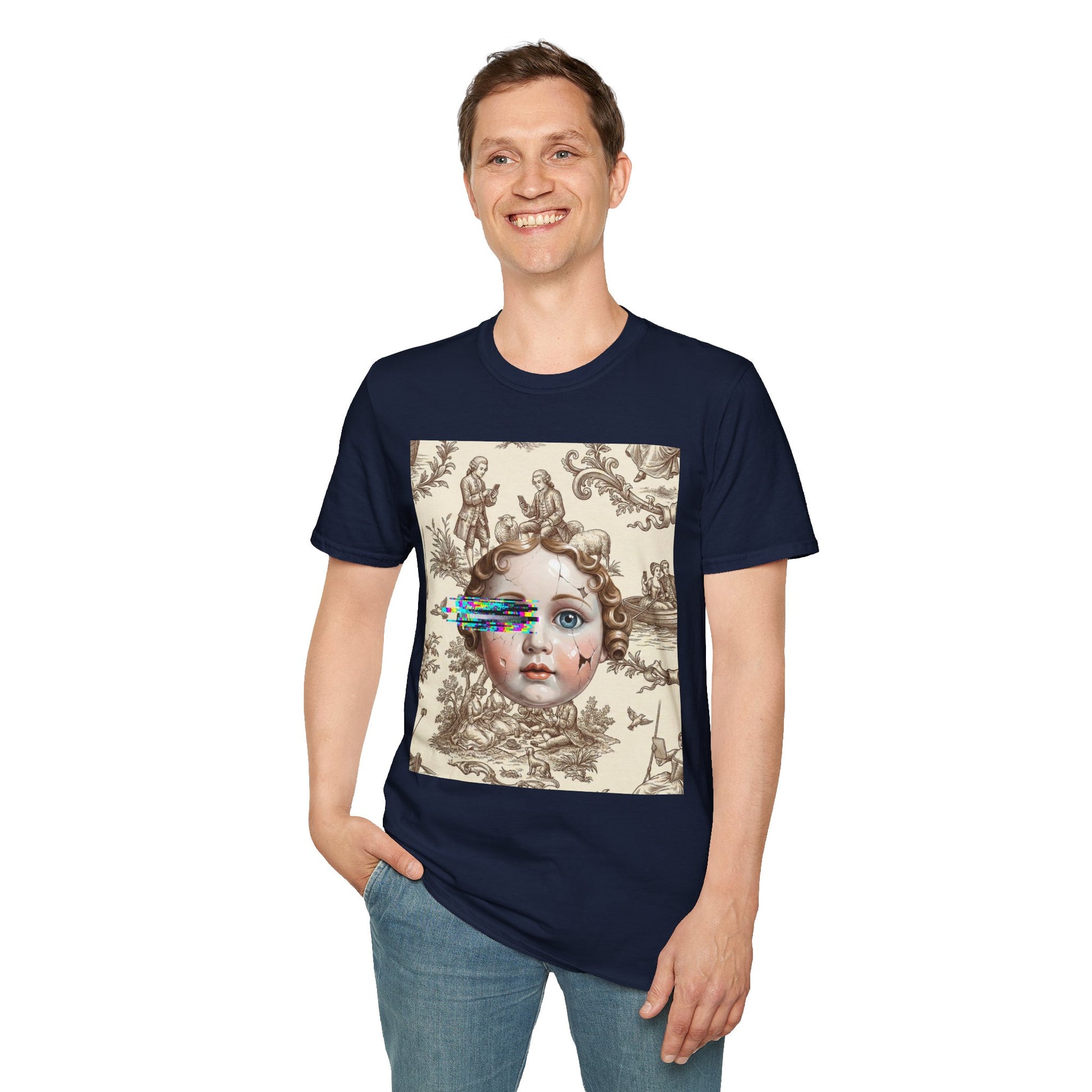This lightweight cotton tee carries a small, strange moment—the vintage porcelain face of a cherubic doll set against an antique toile backdrop, disrupted by a bright, glitch-like streak of color across one eye. It’s a quiet clash of eras: old-world ornamentation layered with a sudden, modern interruption. Wear it when you want an offbeat conversation starter that reads artful and slightly uncanny. The soft ring-spun fabric sits close to the body without feeling heavy, and the clean crew neck and classic fit keep the silhouette simple so the artwork takes center stage. Machine-washable and ethically sourced, it’s made to be lived in and layered over shirts, under jackets, or worn solo on cool evenings.