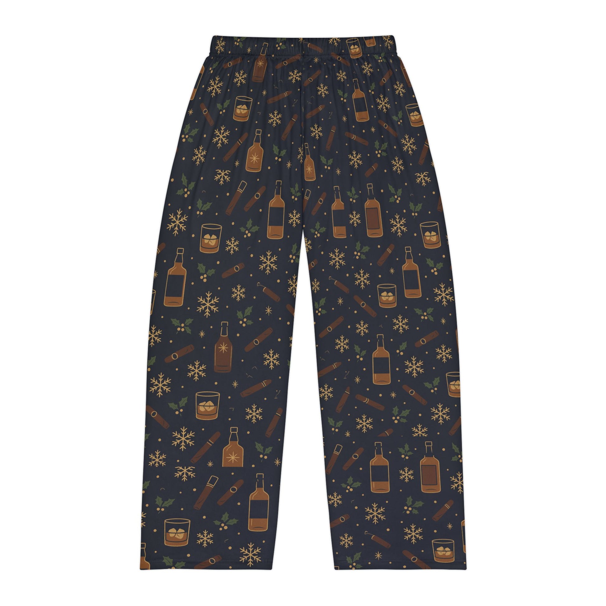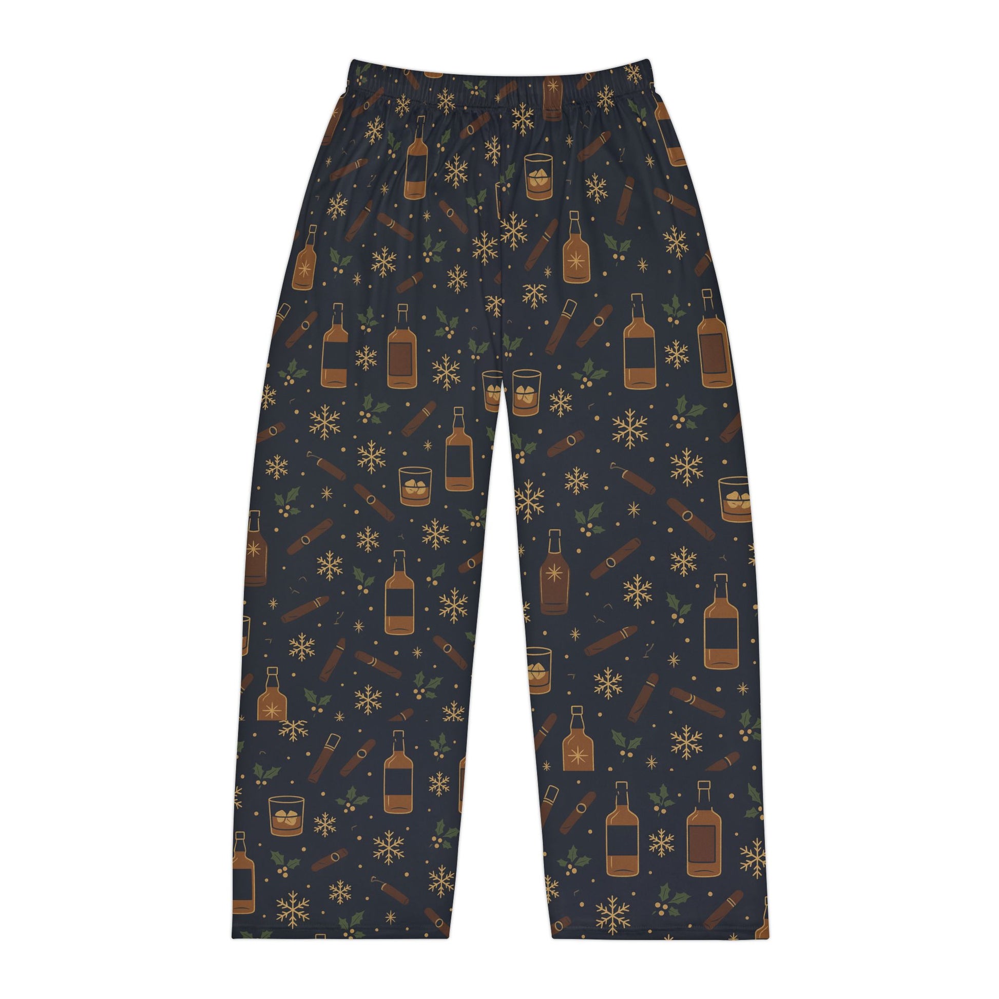 Whiskey Night Pajama Pants — Men’s Cozy Lounge Sleepwear with Bottle & Snowflake Print