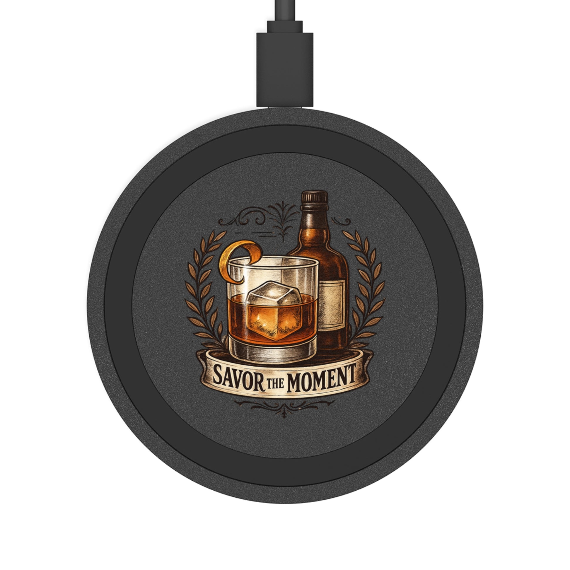 A compact wireless charging pad that brings a touch of cozy, vintage barroom charm to your everyday routine. The rechargeable disc features a warm whiskey-and-glass illustration framed by a laurel wreath and the words “Savor the Moment,” inviting a slow, intentional pause amid a busy day. Slim and lightweight, it slips into a bag or lives on a bedside table without demanding attention — just place your compatible smartphone on the pad and watch it quietly refill. The bold, crisp printing keeps the artwork vibrant, while the durable double-wall plastic housing and included USB-to-micro-USB cable make it a reliable companion whether you’re at home, in the office, or traveling. Supports standard 5W wireless charging through most plastic cases, and works across a wide range of iPhone and Android models.