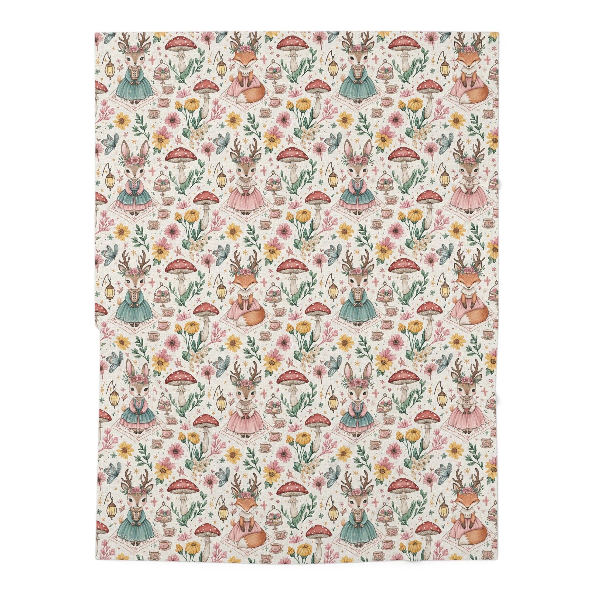 A soft, whimsical swaddle blanket that wraps little ones in a storybook world. Illustrated woodland friends — fawns in tutus, foxes, mushrooms and wildflowers — float across a creamy background in gentle pinks, teal and warm mustard. The lightweight jersey polyester feels smooth against delicate skin and drapes easily for swaddling, stroller naps, or quiet cuddle time. The one-sided print keeps the pattern vivid where it shows most, while the reverse stays clean and breathable. This blanket brings a calm, enchanted vibe to nursery hours and everyday moments, inviting slow mornings, outdoor picnics, and sleepy storytime under dappled light.